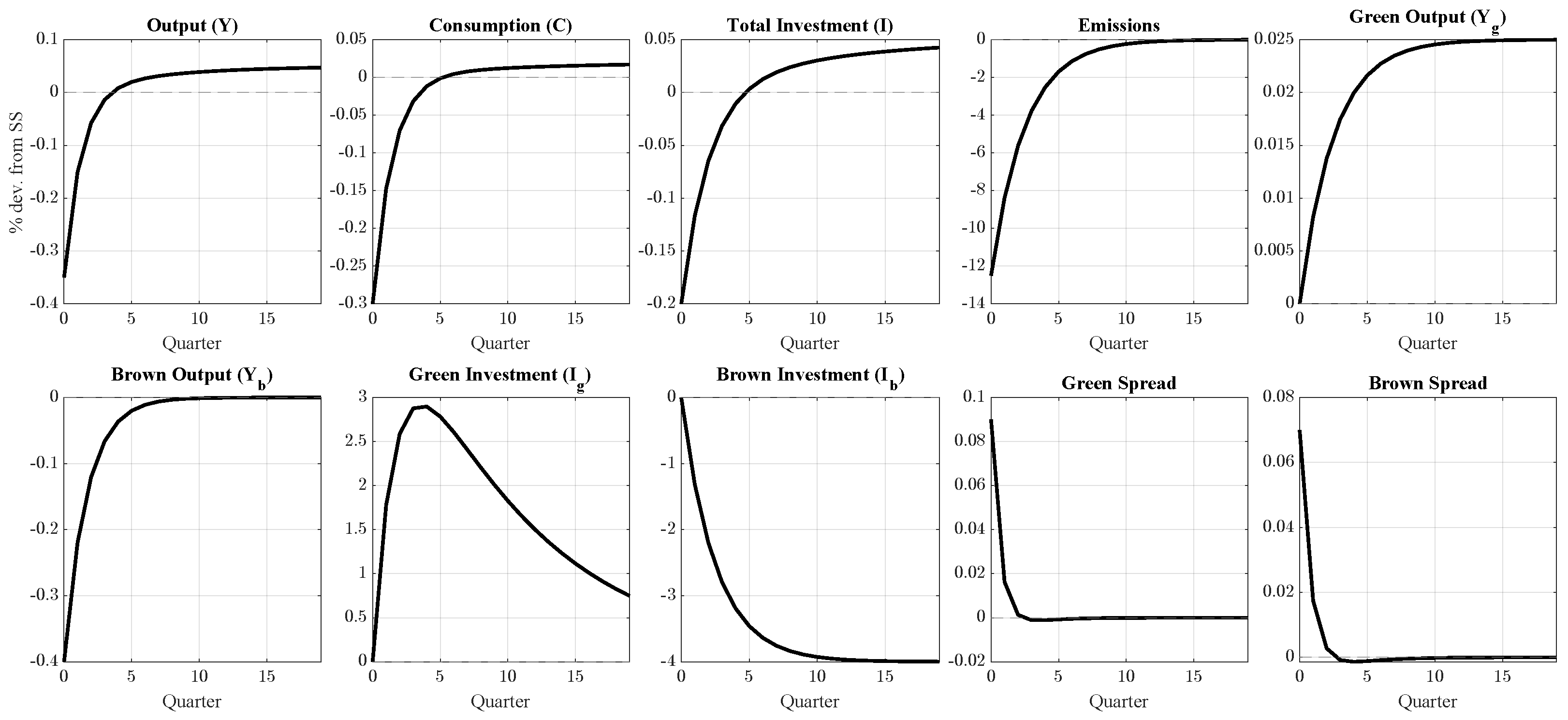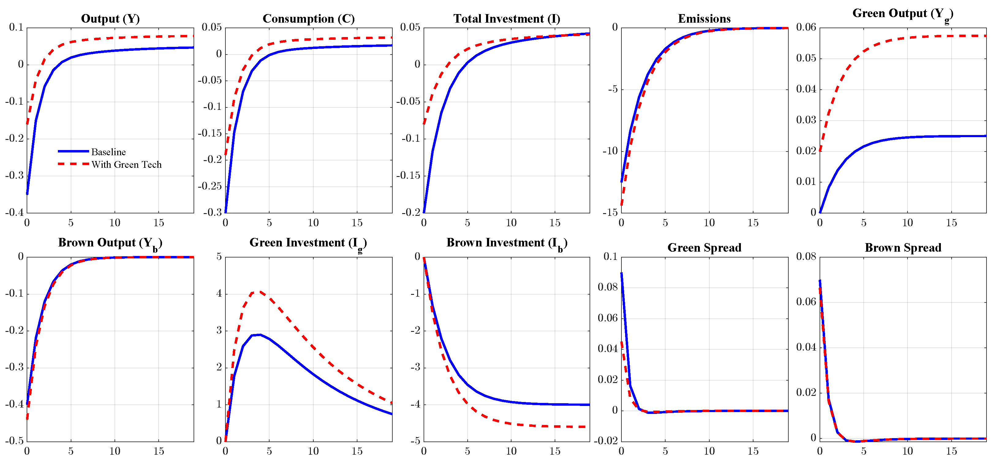A second message is that green innovation materially changes the time profile of the adjustment. When the green technology frontier responds endogenously, green investment rises more strongly, the recovery in output and investment is faster, and the initial spread response is smaller. The underlying logic resonates with the directed technical change literature, where a persistent price signal shifts research effort toward cleaner technologies, raising future productivity and lowering the macro cost of emissions reductions [