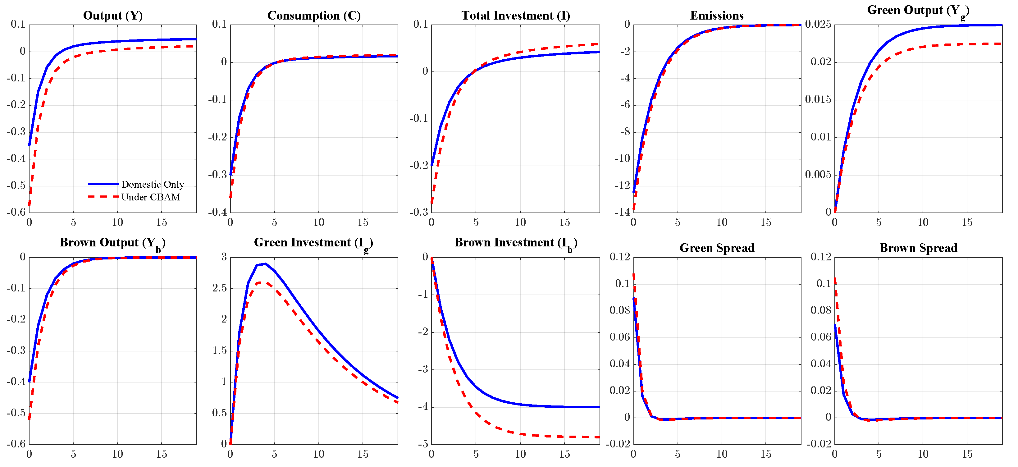 72]. Our framework nests this insight but places it in an open-economy setting where external policy interacts with domestic decarbonization. In particular, the CBAM wedge directly weakens export revenue in exposed activities, which tightens borrowing constraints and raises spreads precisely when the economy must reallocate investment toward the expanding green sector. This open-economy interaction is central for interpreting why similar domestic carbon-pricing moves can have different short-run macro-financial costs under different external regimes.