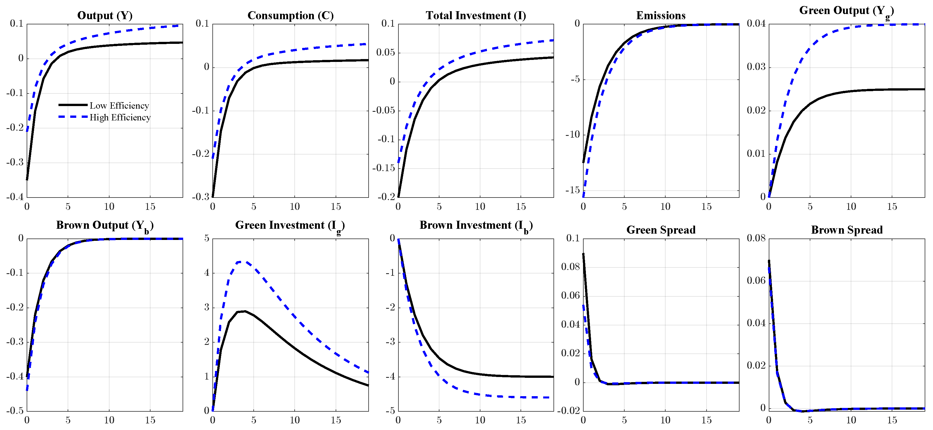 With lower frictions, spreads are less prone to large spikes and normalize faster. Green investment responds more vigorously, supporting a quicker rise in green output and a smoother aggregate adjustment. Emissions decline in both cases, but the comparison suggests that the economy can reach similar near-term emissions reductions with less disruption when the financial system is better able to accommodate the shift in investment composition. In this sense, carbon pricing provides the direction of change, while financial conditions influence how costly the journey is.