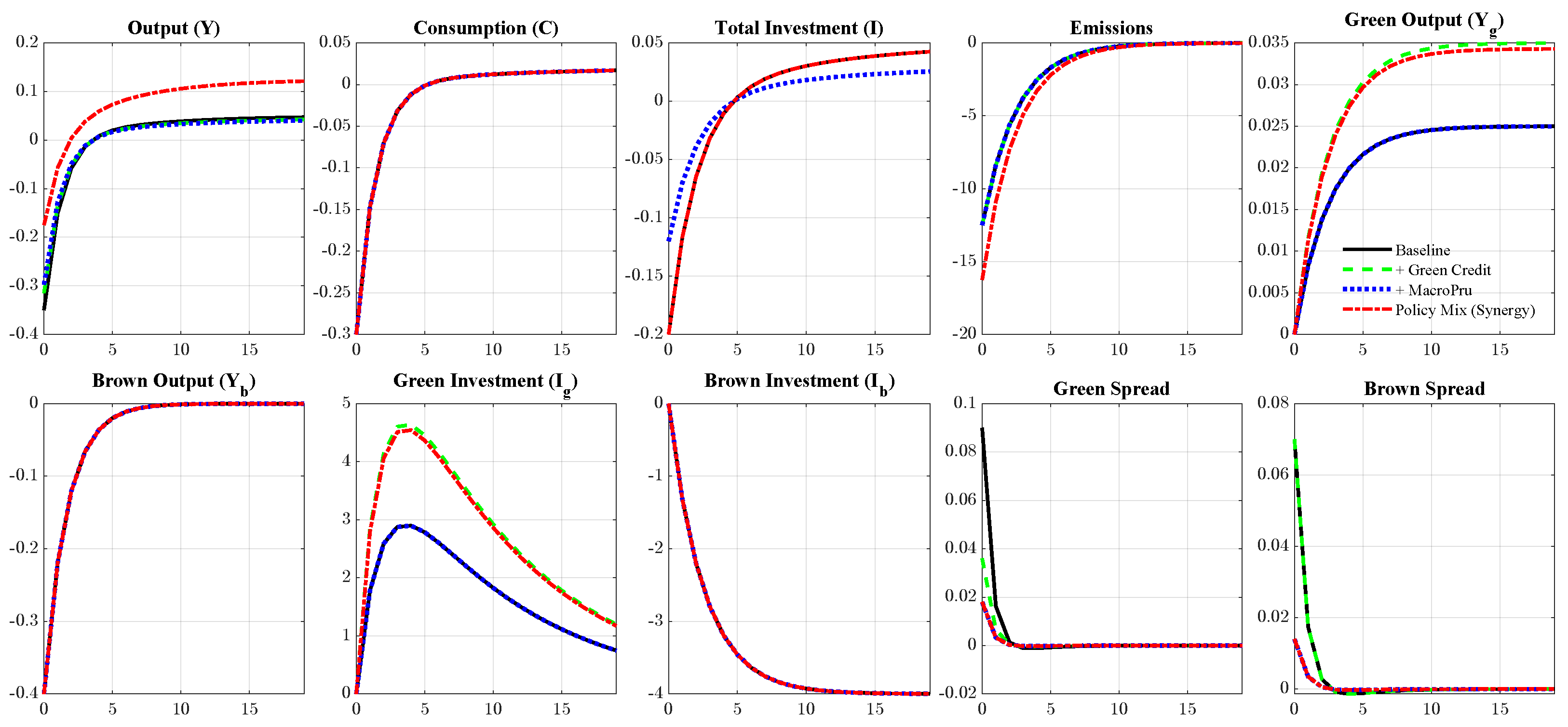 Macroprudential policy operates through a different channel. Its most visible effect is a reduction in the initial spike in spreads, especially on the brown side, and a smoother normalization thereafter. The improvement in financial conditions helps stabilize the early quarters, although the expansion in green investment is not as pronounced as under green credit support. In other words, prudential policy mainly limits the amplification from risk premia during the reallocation episode.