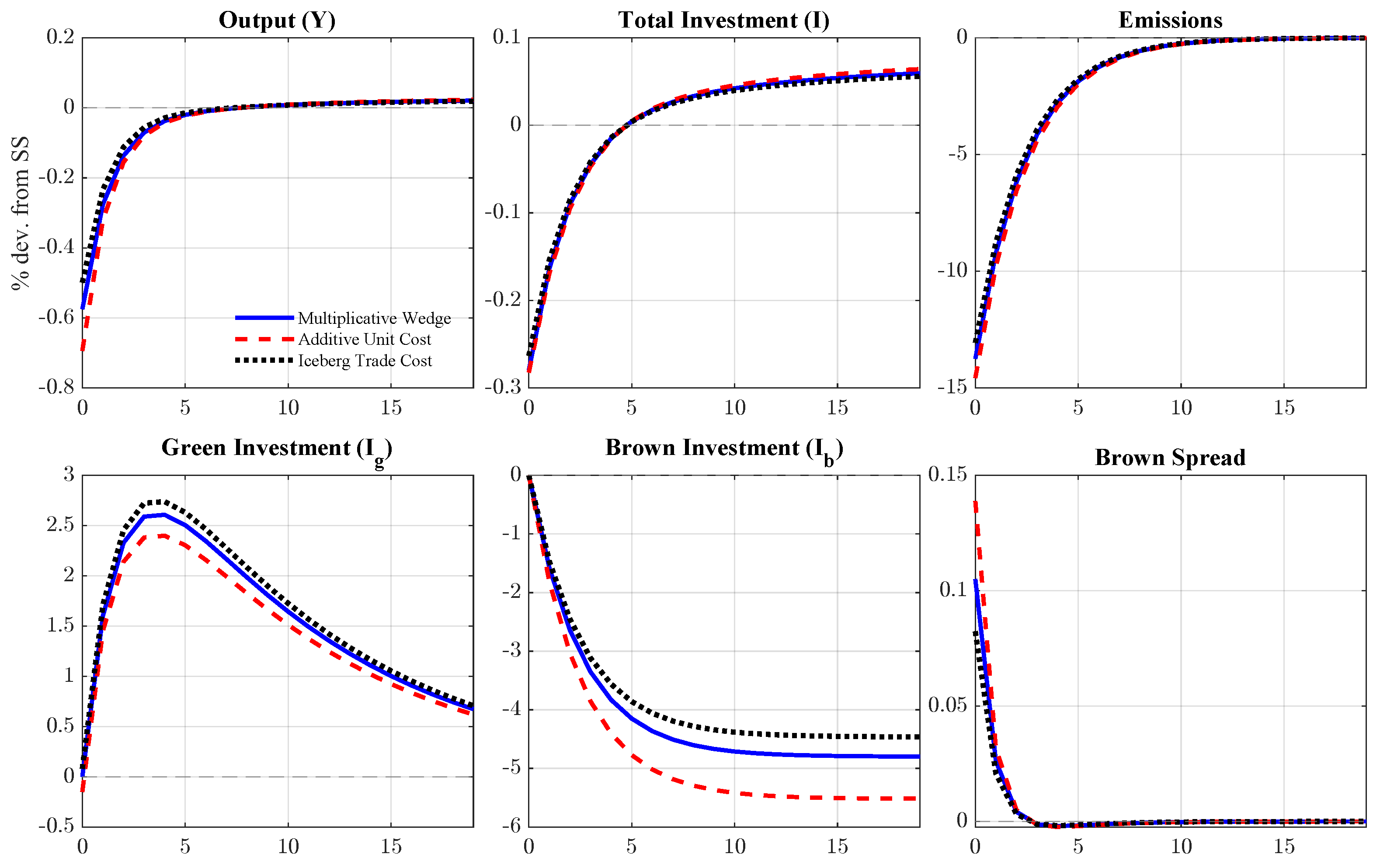 Figure 7 shows that the dynamics of output, investment, emissions, sectoral reallocation, and brown spreads are very similar across the three representations. The key message is unchanged: CBAM amplifies the near-term adjustment by compressing net export receipts for emissions-intensive activities, weakening cash flows and tightening borrowing conditions, while the medium-run transition continues to be driven by reallocation toward the green sector.