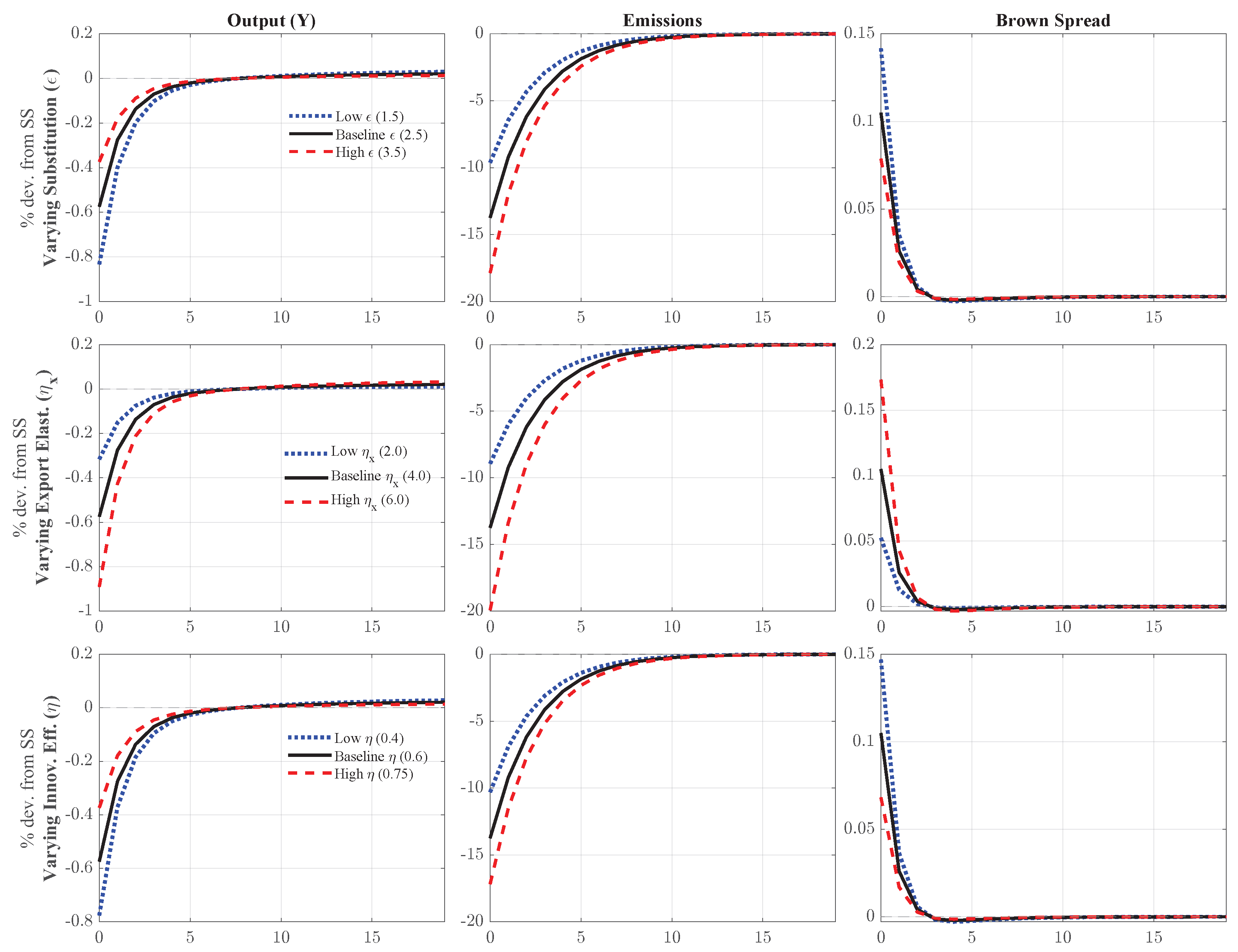 Figure 8 summarizes the sensitivity results using three outcomes that map directly to the paper’s core mechanisms. Output captures the near-term macroeconomic cost of adjustment, emissions capture the effectiveness of the transition, and the brown spread captures the role of transition risk in financial amplification. Three patterns stand out. First, higher substitutability across sectors lowers the near-term output loss and yields a larger initial emissions decline, consistent with faster reallocation away from emissions-intensive activity. Second, a higher export-demand elasticity strengthens the effective external constraint created by CBAM, leading to a deeper initial output contraction, a stronger emissions reduction driven by a sharper brown-side adjustment, and a more pronounced spike in the brown spread. Third, higher innovation efficiency improves the transition path by accelerating the green-side expansion, which attenuates the near-term output loss and moderates the spread response while preserving substantial emissions reductions. The qualitative conclusions are robust across all configurations. Coordinated carbon pricing continues to deliver rapid emissions abatement through reallocation, CBAM continues to increase the sensitivity of the transition to external and financial conditions, and the macro-financial amplification channel remains central for understanding near-term adjustment costs.
