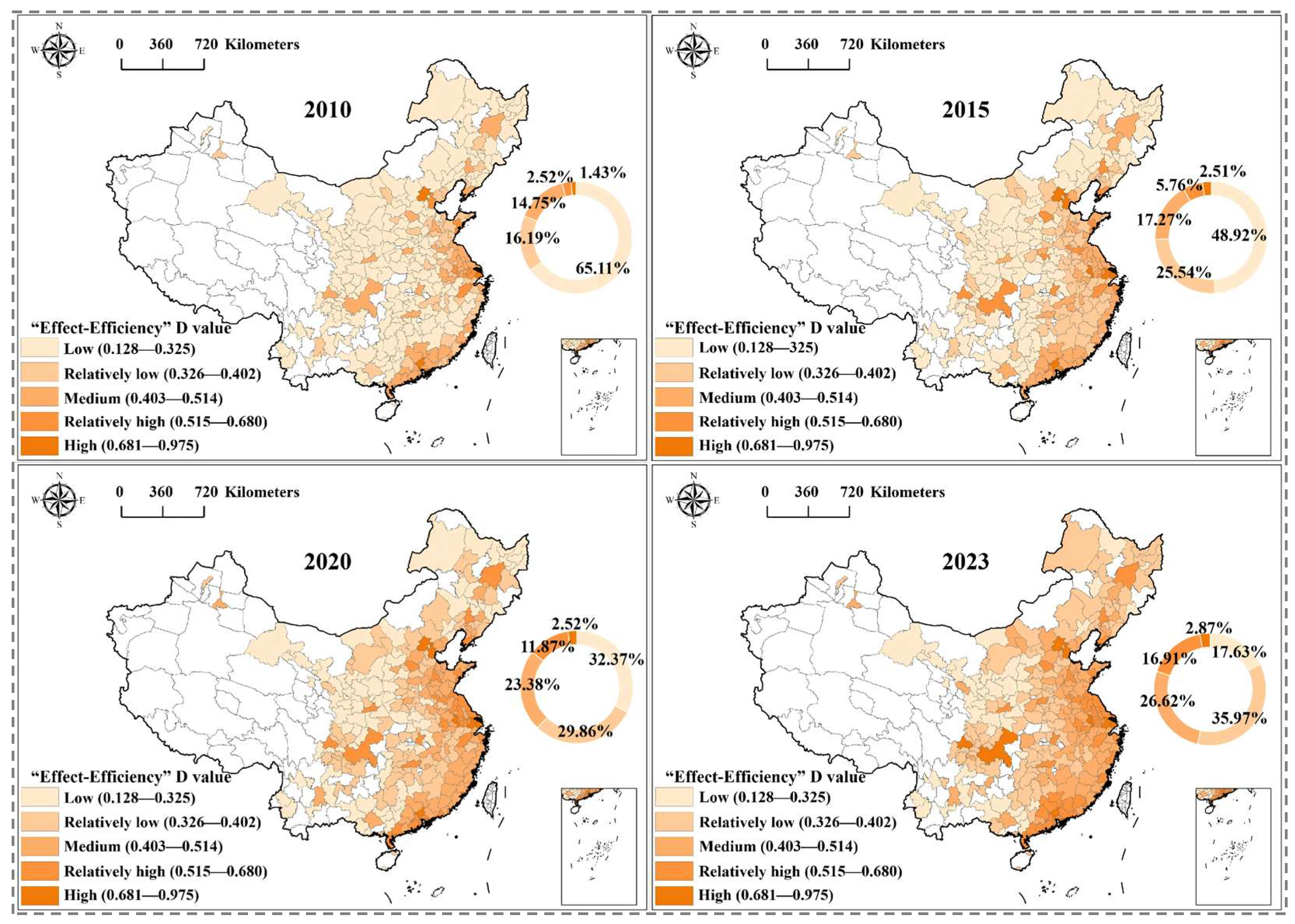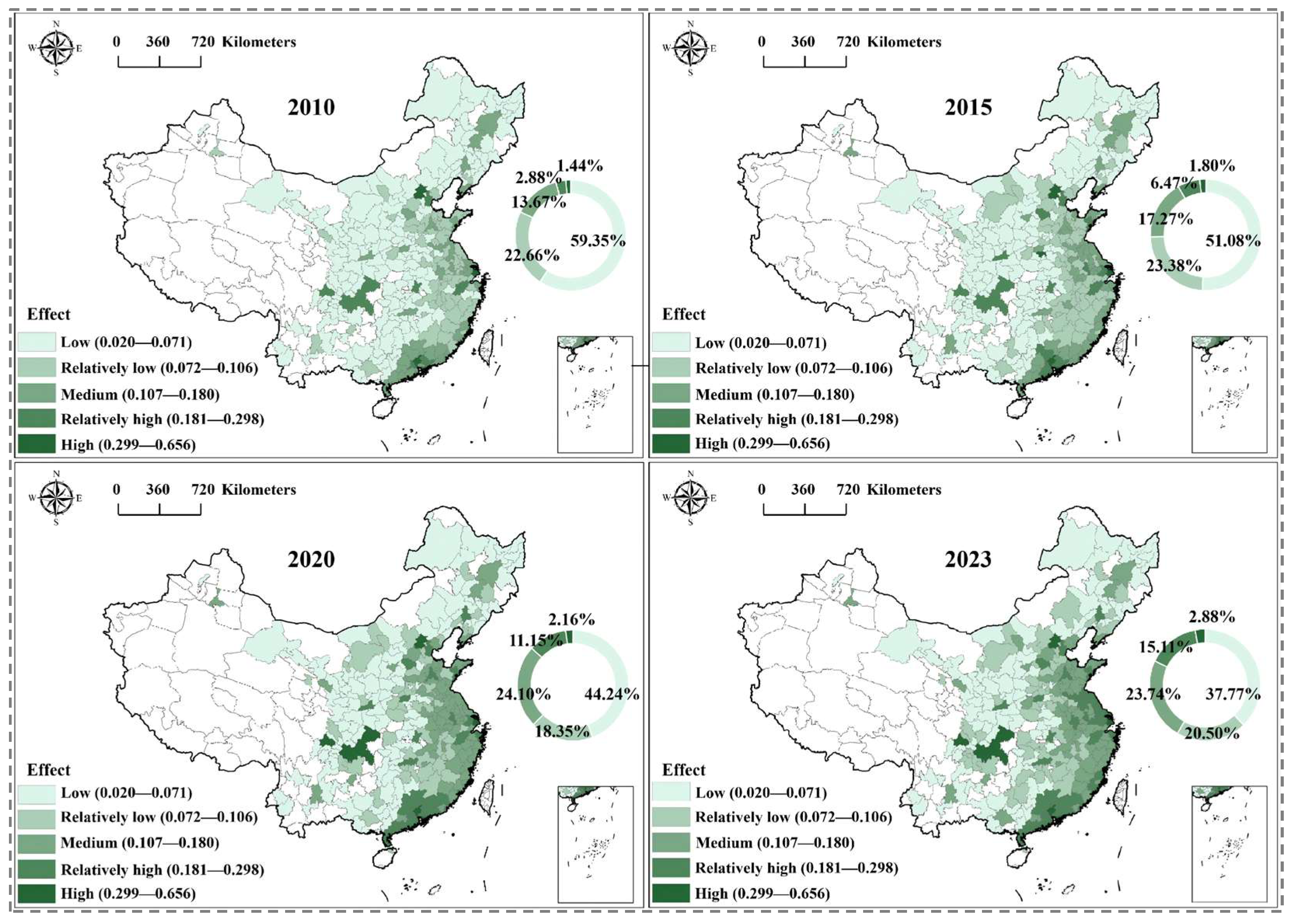- A marked upward trajectory in the effect dimension of urban low-carbon resilience systems was observed during the study period. Nevertheless, persistent regional disparities were identified, with eastern regions exhibiting stronger performance than their western counterparts. Specifically, in 2010, a low level of effect was achieved by 59.35% of cities, whereas only 17.99% reached medium or higher levels. By 2023, the proportion of cities with low effect had declined to 37.77%, while the share of cities attaining medium or higher effect levels increased to 41.73%. Overall, a significant improvement trend in effect-oriented governance within China’s urban low-carbon resilience systems was demonstrated. Moreover, relatively superior performance in this dimension was exhibited by eastern coastal cities such as Beijing, Shenzhen, Guangzhou, and Shanghai, whereas cities in central and western regions were found to lag behind. At the same time, core cities within major national strategic clusters—including Chongqing, Chengdu, Zhuhai, Shanghai, and Shenzhen—were shown to perform robustly, progressively driving the development of surrounding urban areas.