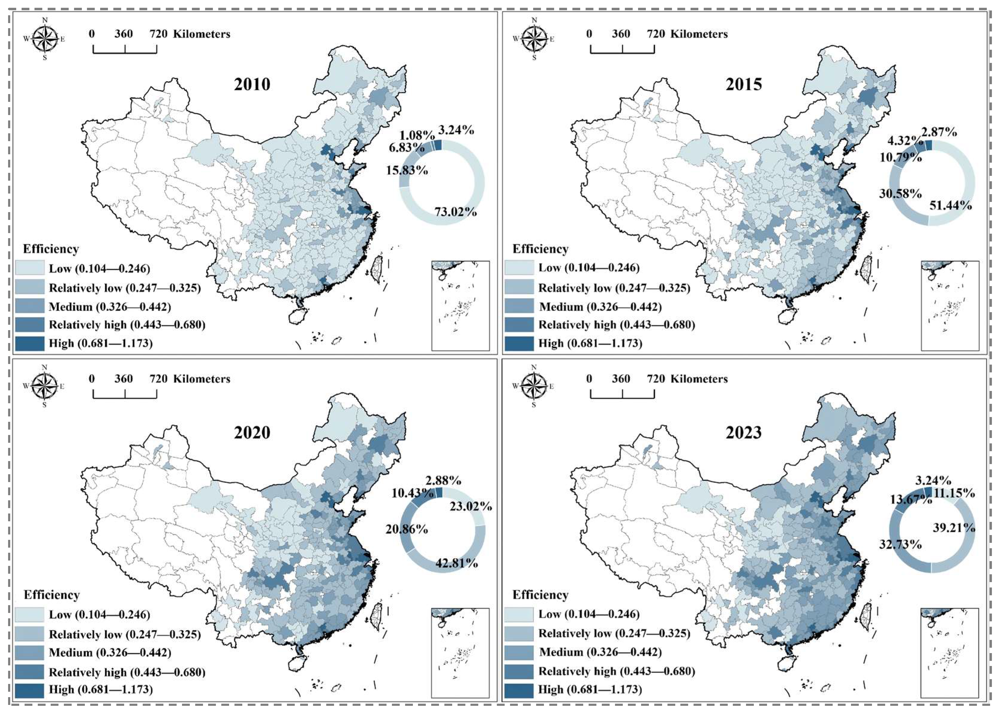 - A marked upward trajectory in the efficiency dimension of urban low-carbon resilience systems was observed throughout the study period, with notable momentum in catching up and surpassing being exhibited by cities in central and western regions. Specifically, in 2010, low efficiency levels were recorded for 73.02% of cities, while only 11.15% were classified as medium or above. By 2023, the proportion of cities operating at low efficiency levels had declined to 11.15%, whereas cities achieving medium or higher efficiency levels accounted for 49.64%. Overall, a substantial improvement in the efficiency utilization level of China’s urban low-carbon resilience systems was demonstrated. Moreover, outstanding efficiency utilization was observed in first-tier and new first-tier cities such as Beijing, Shanghai, Guangzhou, Shenzhen, Chongqing, and Chengdu, while cities in central and western regions were found to lag comparatively. Nevertheless, from a spatial evolution perspective, an advantage in the pace of catching up and surpassing eastern counterparts was identified for cities in central and western regions.