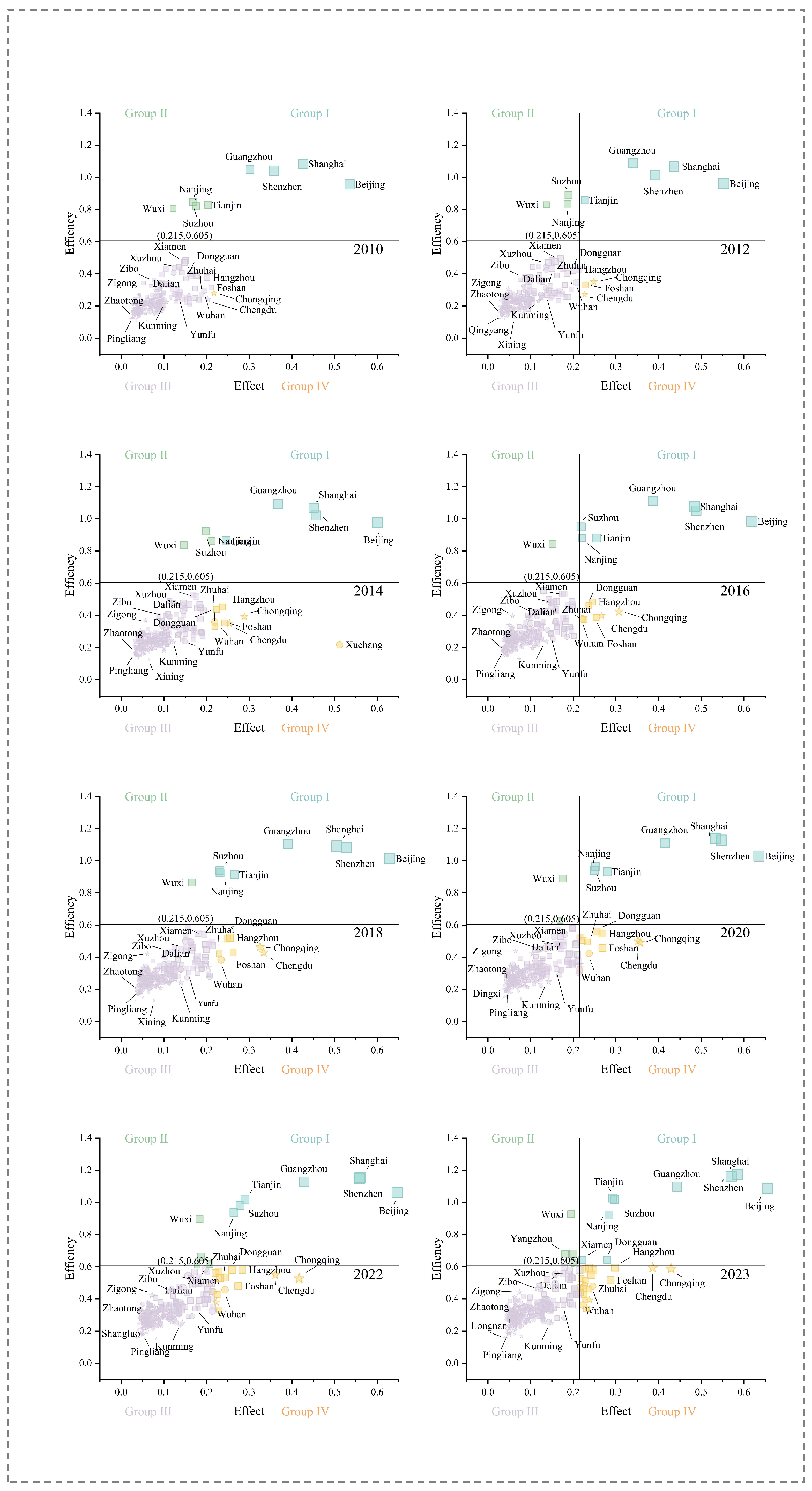 - Establish differentiated, diagnostic collaborative governance mechanisms to eliminate structural misalignments in urban transformation. For eastern cities exhibiting high impact but low efficiency, policy priorities should shift from expanding inputs to optimizing governance processes and enhancing the conversion efficiency of energy and capital. For central and western cities demonstrating high efficiency but low impact, it is recommended to leverage their efficient resource endowments by expanding green infrastructure investment. Whilst enhancing efficiency utilization, elevating governance standards, and output effect to achieve convergence towards high-impact, high-efficiency collaborative development. A dual performance assessment framework is proposed, incorporating both systemic impact governance and efficiency utilization into urban transformation evaluations. For cities demonstrating high impact but insufficient efficiency, assessments should priorities resource utilization efficiency, eliminating governance redundancies through technological and institutional innovation. Implement a coordinated resource allocation mechanism linking the distribution of fiscal funds, land resources, and energy quotas to the level of synergistic development in effective governance and efficient utilization, rather than solely evaluating regional economic growth or isolated environmental indicators. Simultaneously, guide cities to direct limited resources to address systemic weaknesses, aiming for precise allocation.