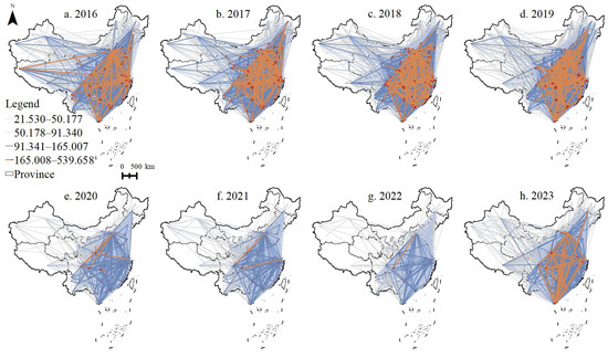 To depict the structural characteristics of the network clearly, this study draws on existing research by selecting the top 10% of intercity tourism information flows as the primary analysis subject [18]. Furthermore, the top 10% of tourism flow data for 2016 served as the baseline. Using the natural breaks classification method (Jenks), these data were divided into four tiers. The thresholds determined from this classification were then applied uniformly to data from other years to facilitate temporal comparison. It should be noted that this top 10% threshold is employed solely for network visualization purposes and is not applied in subsequent model analyses. The results, shown in Figure 2, reveal significant differences in the spatial pattern and connection density of the intercity tourism information flow network across different years. From 2016 to 2019 (Figure 2a–d), medium- and high-intensity intercity tourism information flow linkages increased steadily. During the 2020–2022 period (Figure 2e–g), the tie strength and spatial extent of the tourism information flow network noticeably contracted because of the impact of the COVID-19 pandemic. In 2023 (Figure 2h), following the comprehensive lifting of pandemic control policies, the strength of tourism information flows rebounded substantially; however, the network structure had not yet fully reverted to the pre-pandemic characteristic “diamond” pattern. Additionally, high-intensity linkages were primarily associated with flows from eastern and central origin regions toward western destinations. This pattern reflects a shift in residents’ travel preferences and motivations.