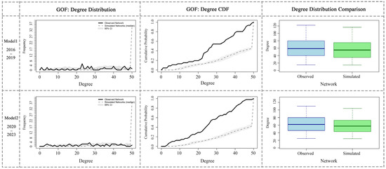 To evaluate the capability of the STERGM in capturing the network evolution process, this study conducted a Goodness-of-Fit (GOF) assessment. The fit between the observed networks and the simulated networks was examined from three dimensions: degree distribution, cumulative distribution function (CDF) of degree, and boxplot-based comparison of degree distributions. The results are presented in Figure 3.