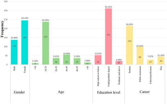 A total of 400 questionnaires were collected, of which 18 were excluded due to missing information or inconsistent responses. Consequently, 382 valid questionnaires were retained for analysis, yielding an effective response rate of 95.5%. The demographic characteristics of the sample are presented in Figure 2. Among the respondents, 64.14% were female, and 64.14% were aged 25 years or younger. In terms of occupation, 55.50% of participants were students. Moreover, approximately 81.41% of respondents had attained an undergraduate degree.