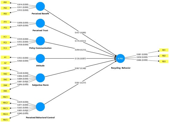 Although the Fornell–Larcker criterion was not fully satisfied for several construct pairs involving PT, this pattern reflects conceptual proximity rather than construct redundancy. Perceived trust, by its nature, is closely related to policy communication, perceived benefits, and behavioral evaluations in institution-dependent pro-environmental behaviors. Importantly, PT, PC, PB, and PBC remain conceptually distinct, capturing system confidence, information credibility, outcome evaluation, and perceived behavioral feasibility, respectively. Overall, the discriminant validity of the measurement model can be considered acceptable within the theoretical framework and empirical context of this study.