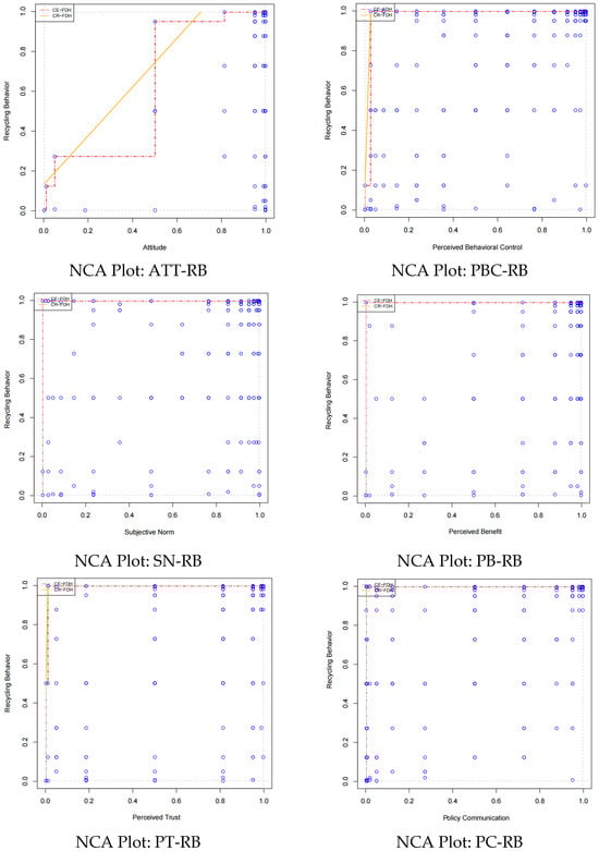 Finally, NCA is introduced to assess whether any conditions are essential prerequisites for recycling behavior. While PLS-SEM and fsQCA both focus on sufficiency, NCA emphasizes necessity, determining whether the absence of a specific condition would prevent the outcome entirely. Using upper-boundary estimation and bottleneck analysis, NCA identifies the minimum levels of conditions required for different levels of behavioral performance [34]. This threshold-based approach provides valuable theoretical insights, distinguishing between factors that merely facilitate behavior and those that are indispensable for its occurrence [95].Identifying necessary conditions is crucial in behavioral research, as certain psychological or contextual factors may not directly prompt action but are vital for its possibility.