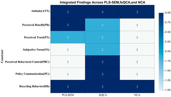 To capture the multifaceted mechanisms underlying consumers’ express packaging recycling behavior, this study employs an integrated analytical framework that combines complementary methodologies. Environmental behavior is influenced by psychological, contextual, and institutional factors, often exhibiting complexity that single methods cannot fully explain. Therefore, this research integrates PLS-SEM, fsQCA, and NCA, allowing for a comprehensive analysis of linear relationships, configurational patterns, and essential prerequisites.