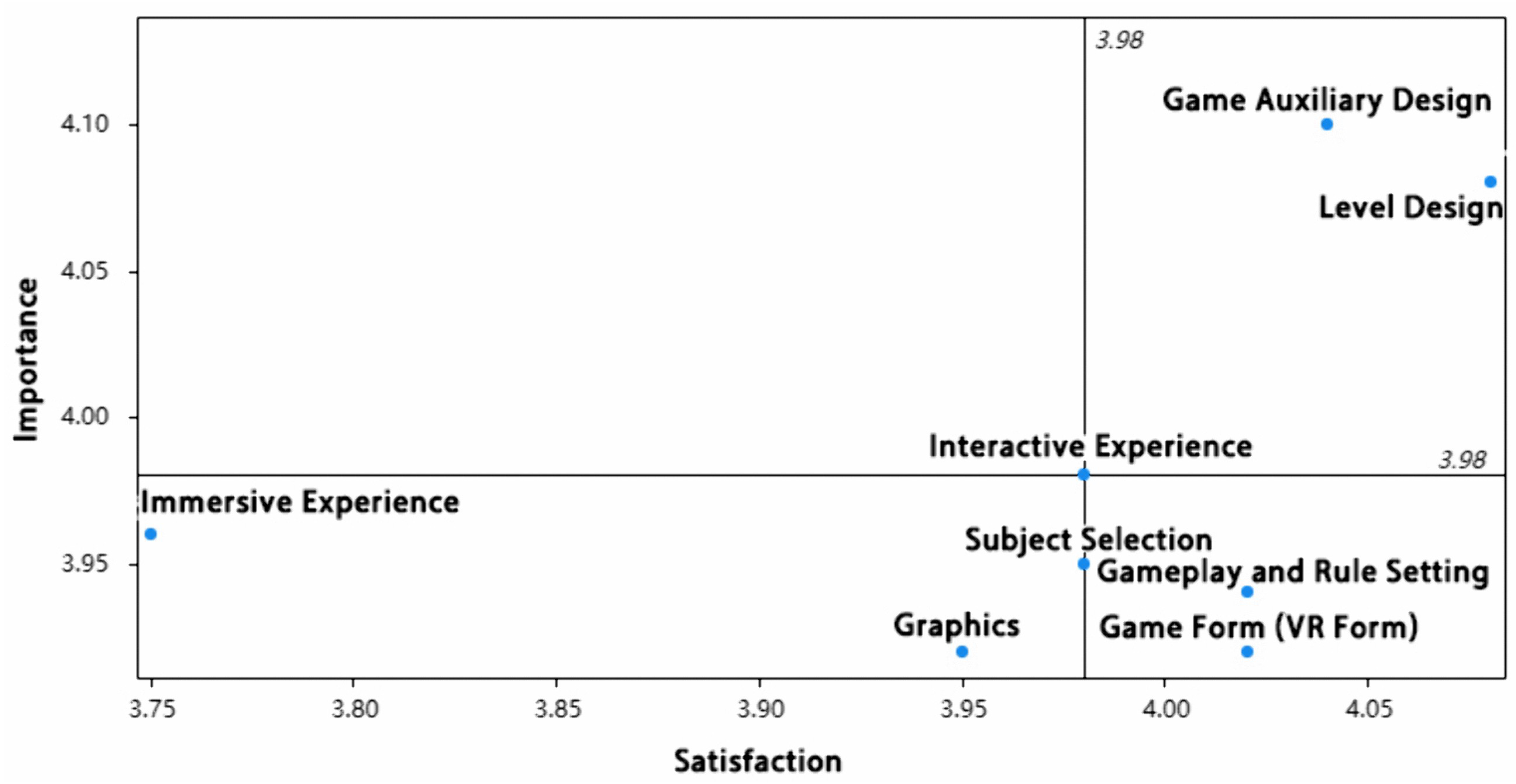 The questionnaire data were analyzed using the four-quadrant (Importance–Performance Analysis) model, based on the mean satisfaction and importance scores for each indicator. All eight indicators—subject selection, game format (VR format), gameplay and rule setting, level design, immersive experience, interactive experience, graphics, and game auxiliary design—were plotted within the quadrant space.