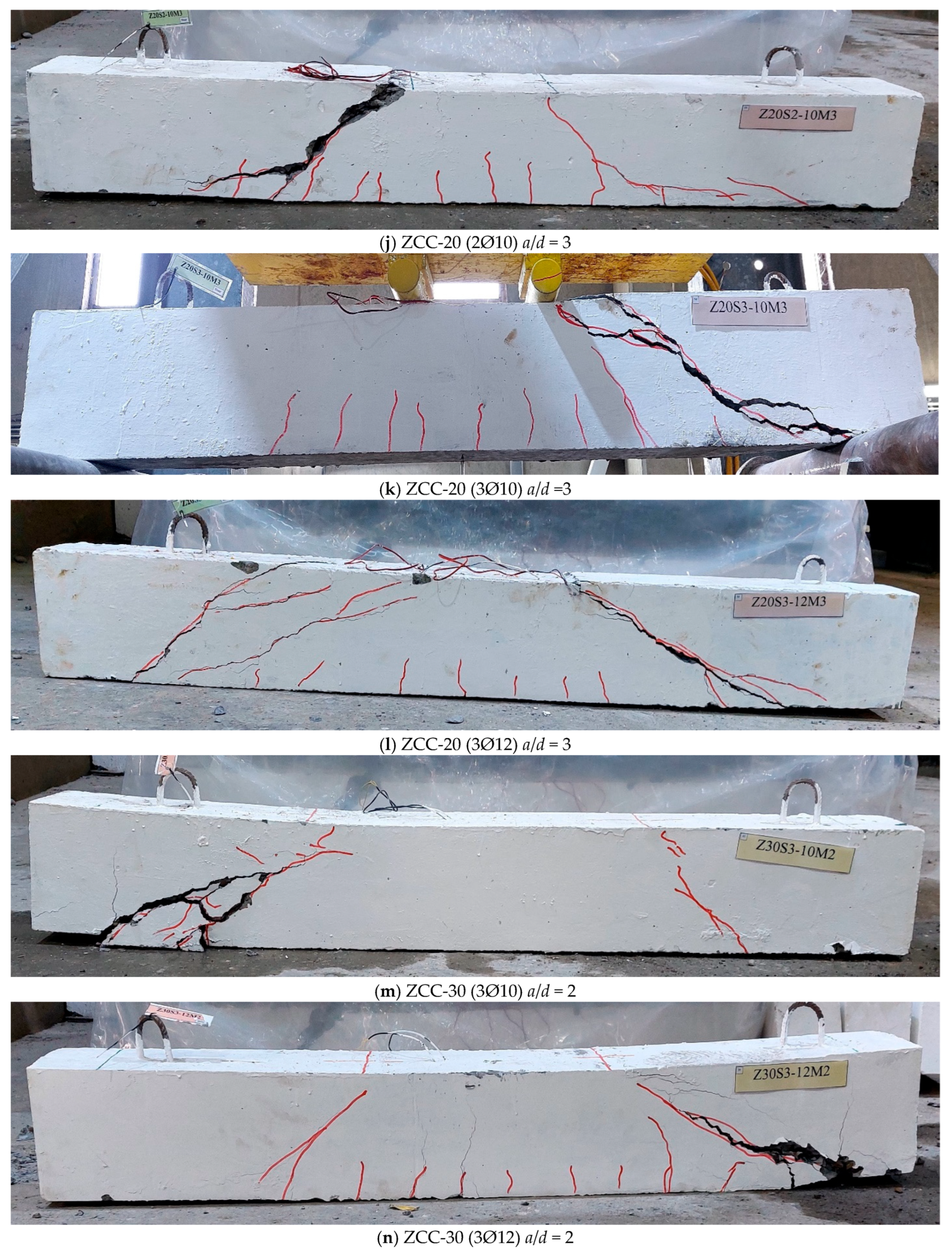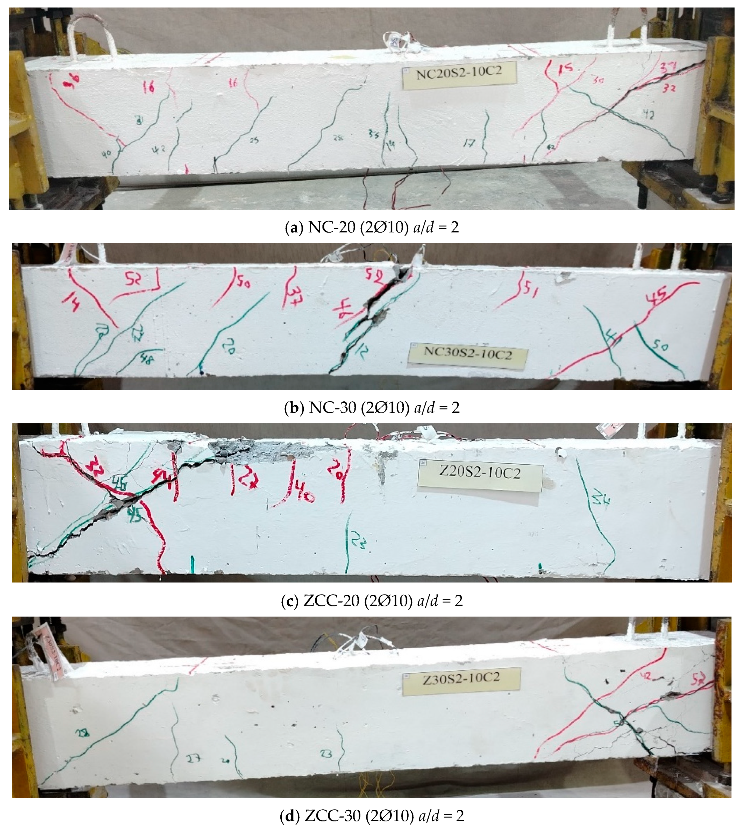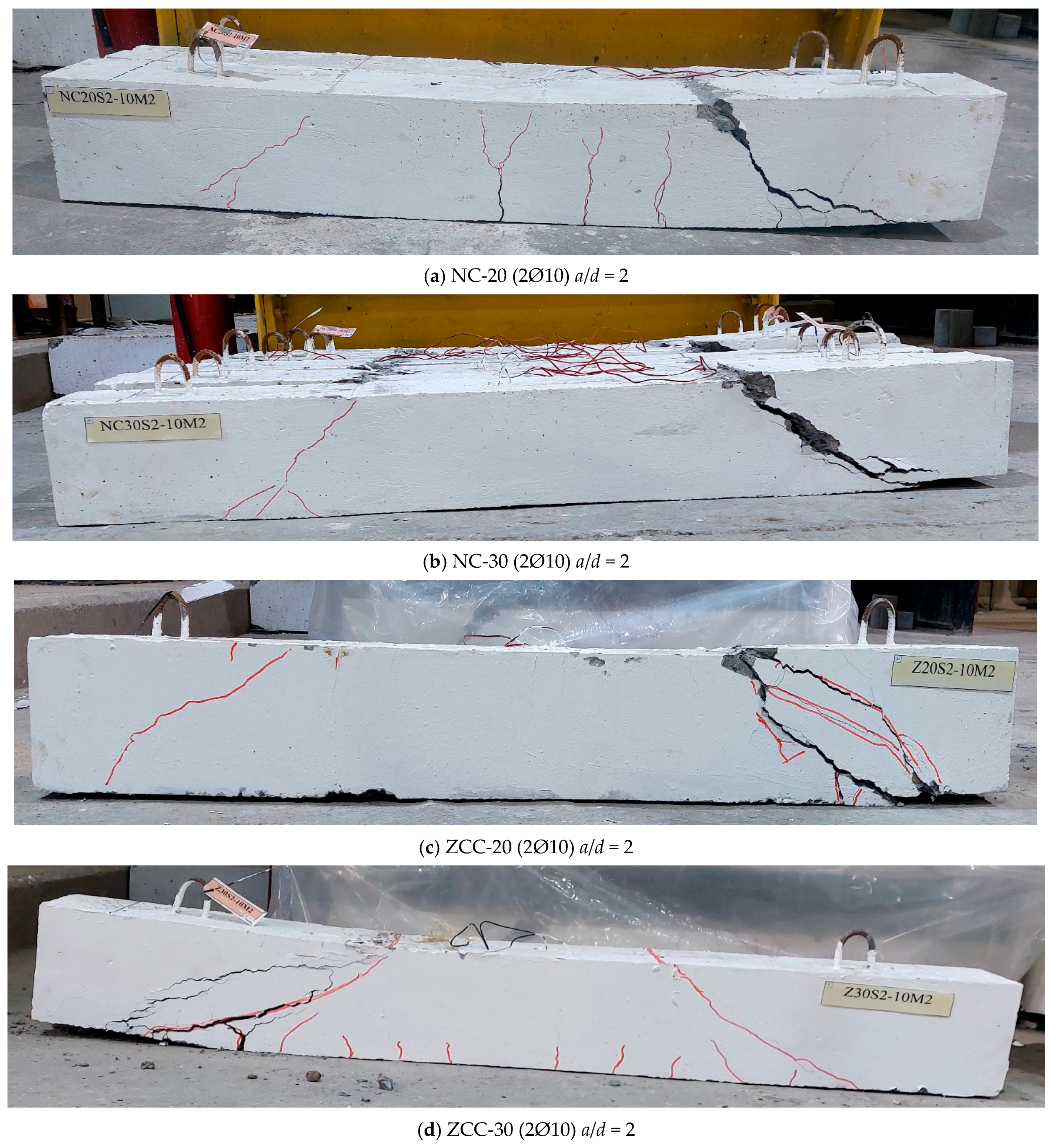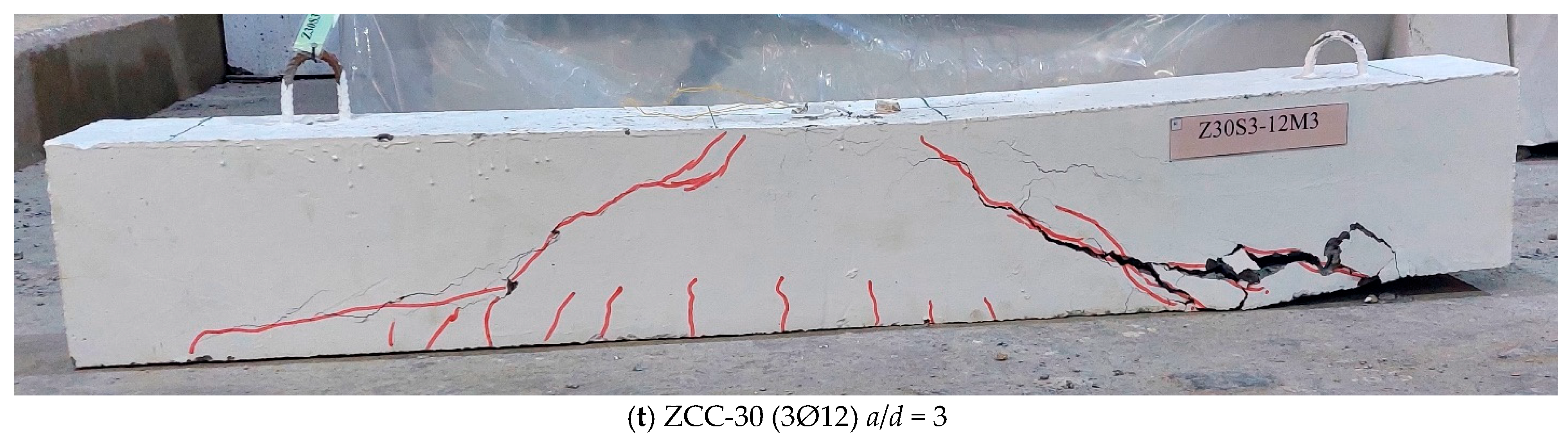 - ZCC beams exhibited cracking and failure patterns similar to those of NC beams, characterized by diagonal shear cracks inclined at 30–45°.