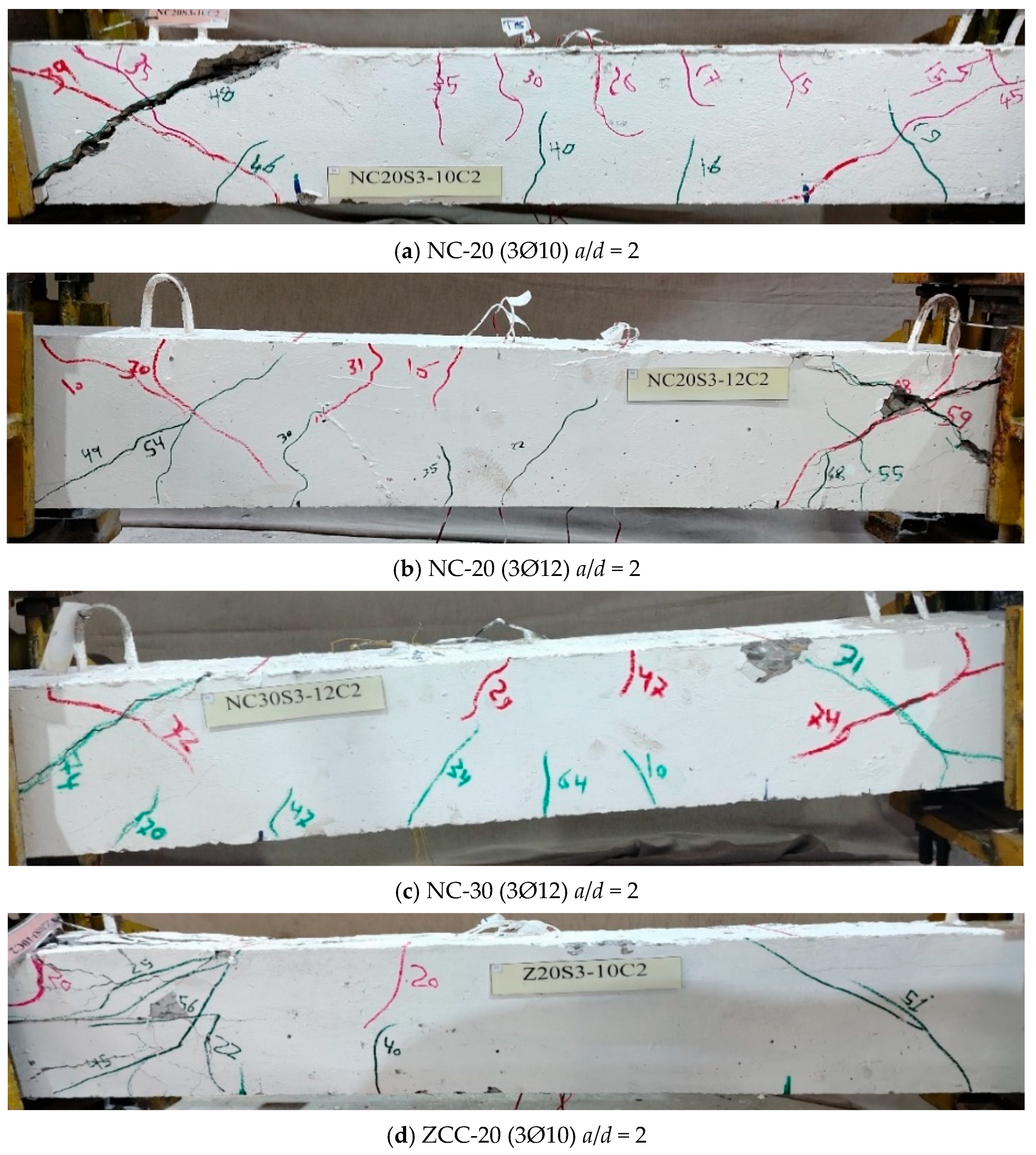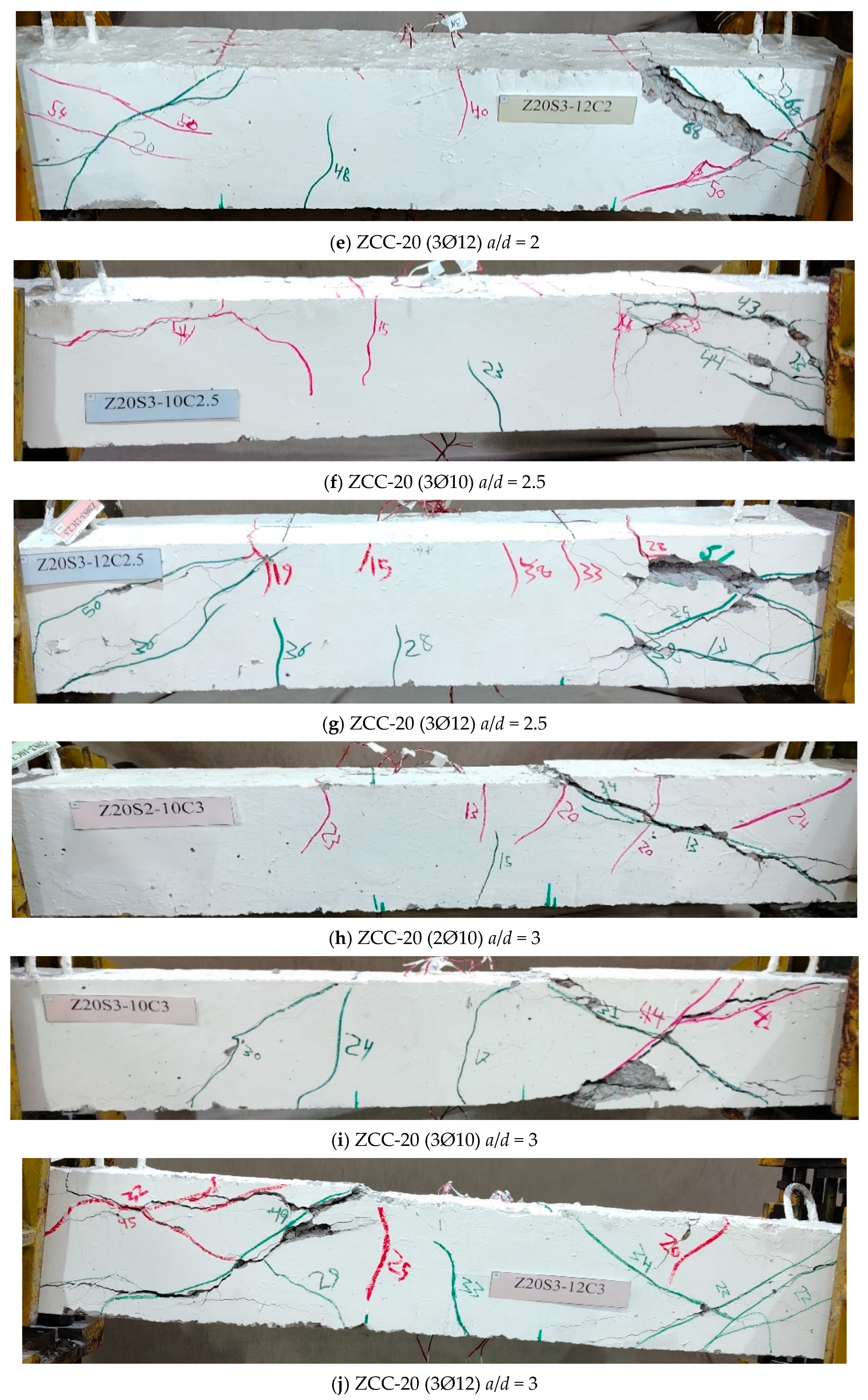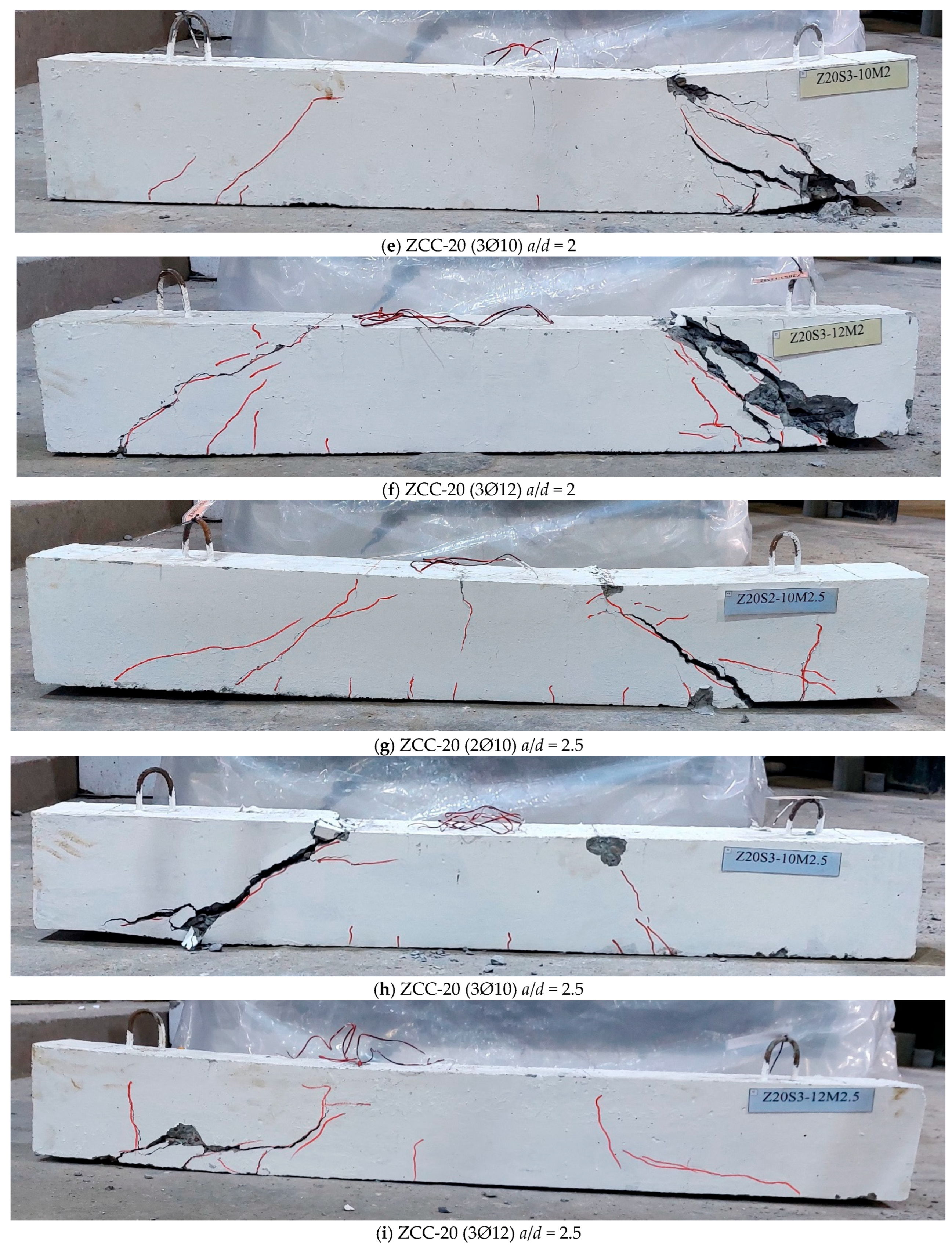 - ZCC beams exhibited cracking and failure patterns similar to those of NC beams, characterized by diagonal shear cracks inclined at 30–45°.