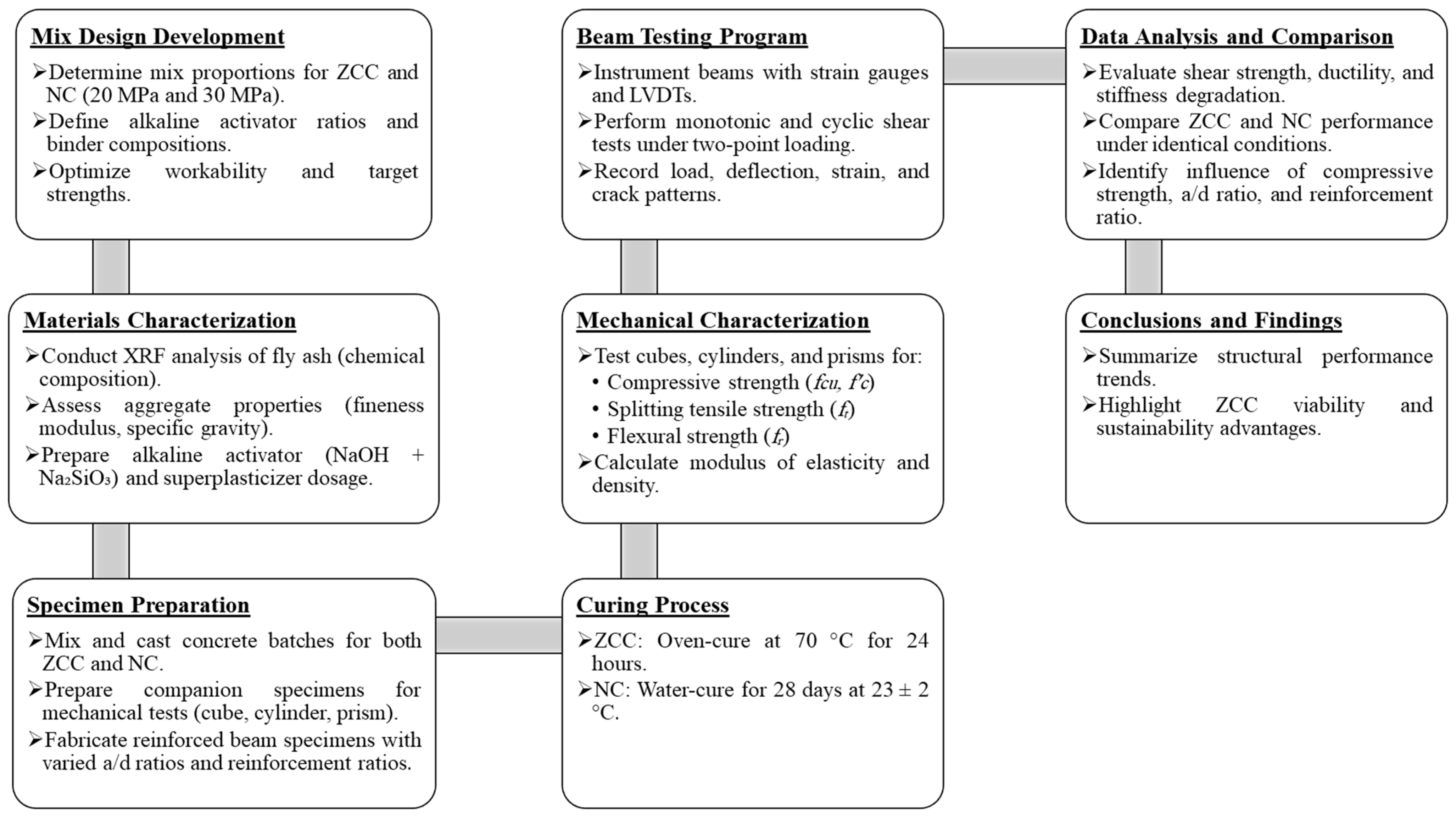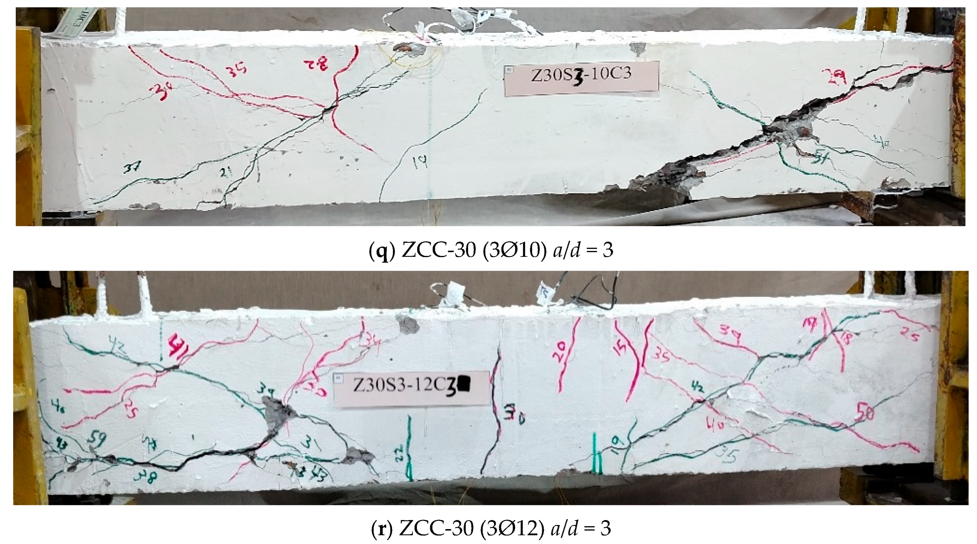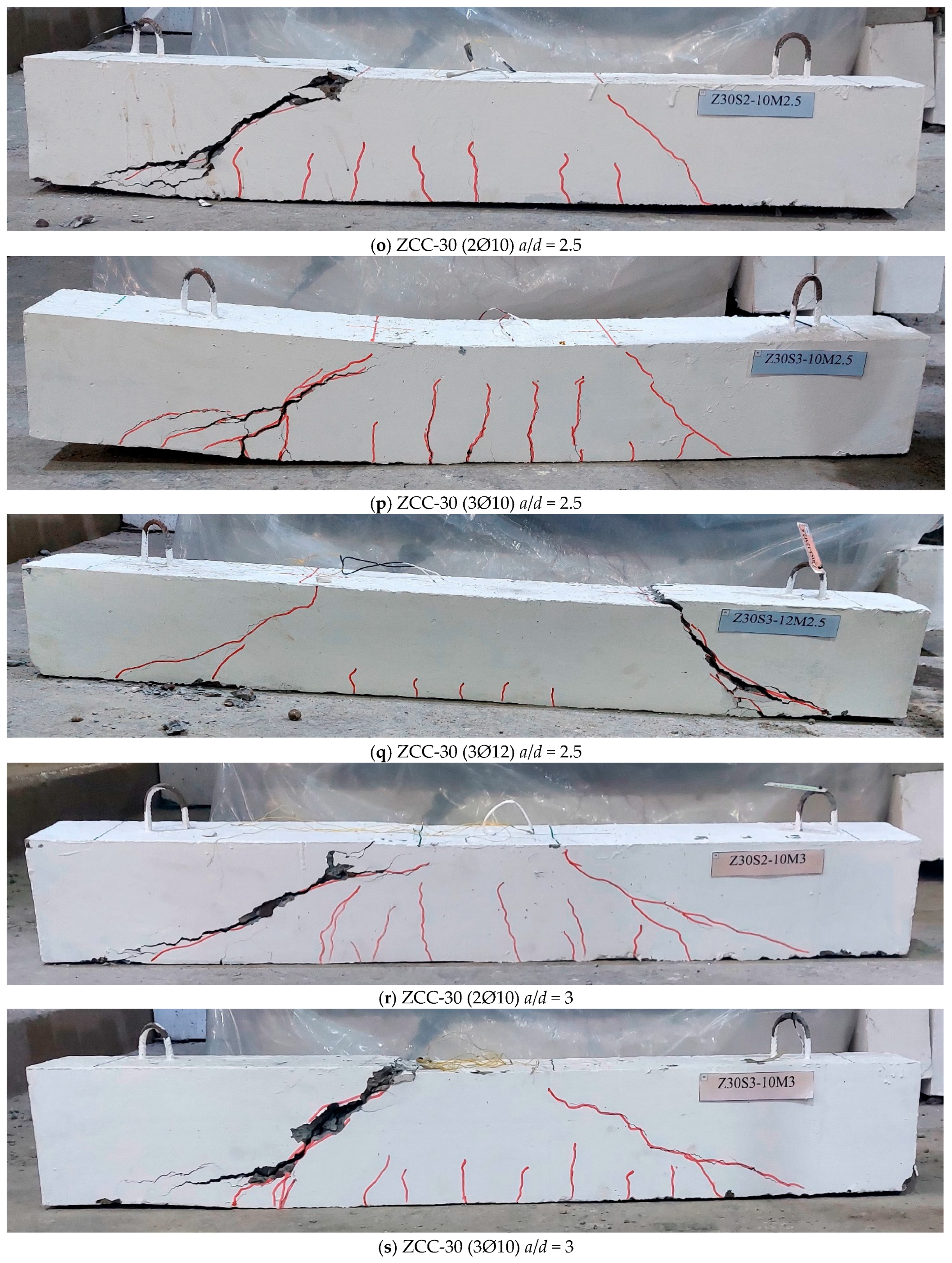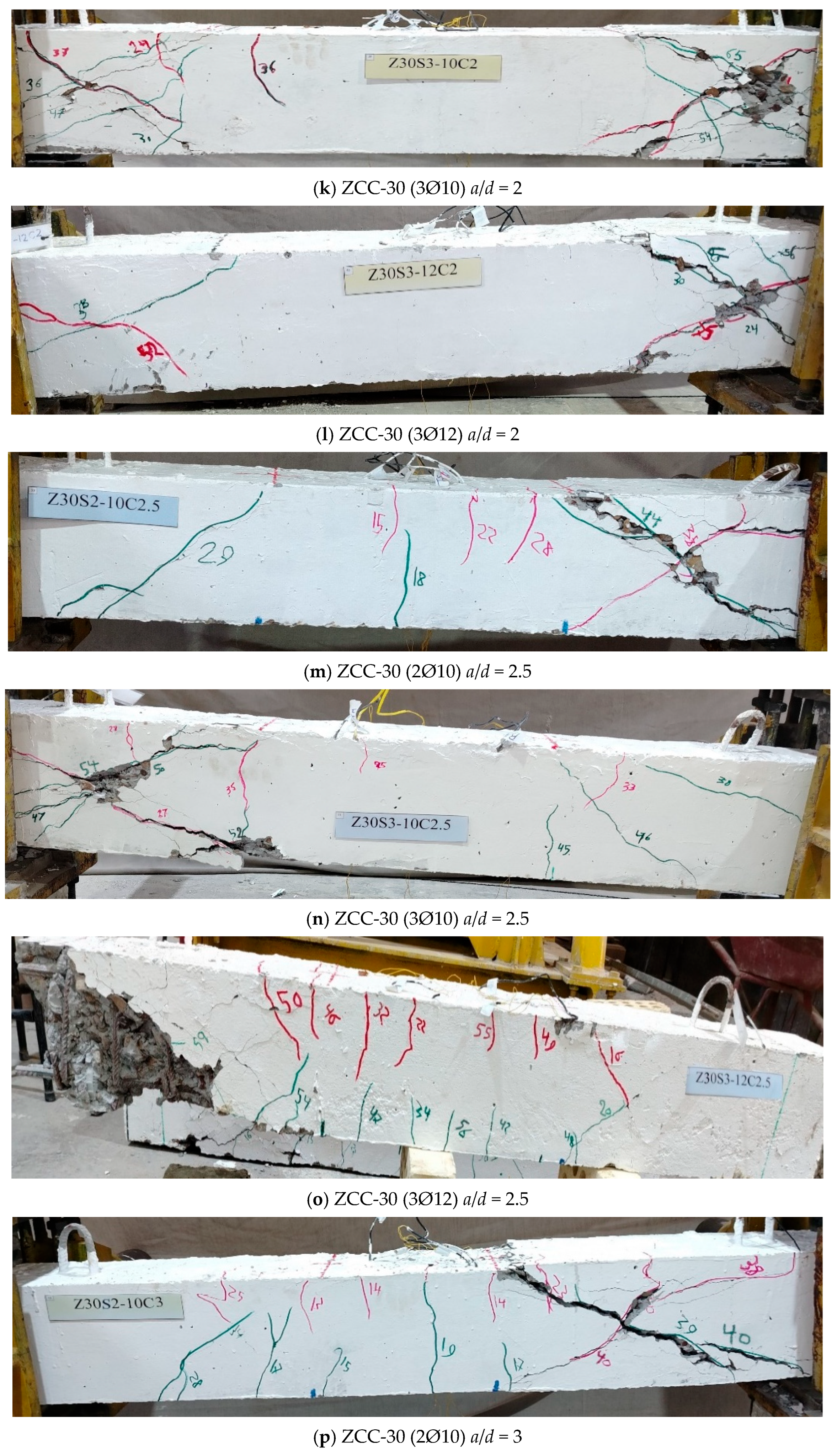 - ZCC beams exhibited cracking and failure patterns similar to those of NC beams, characterized by diagonal shear cracks inclined at 30–45°.