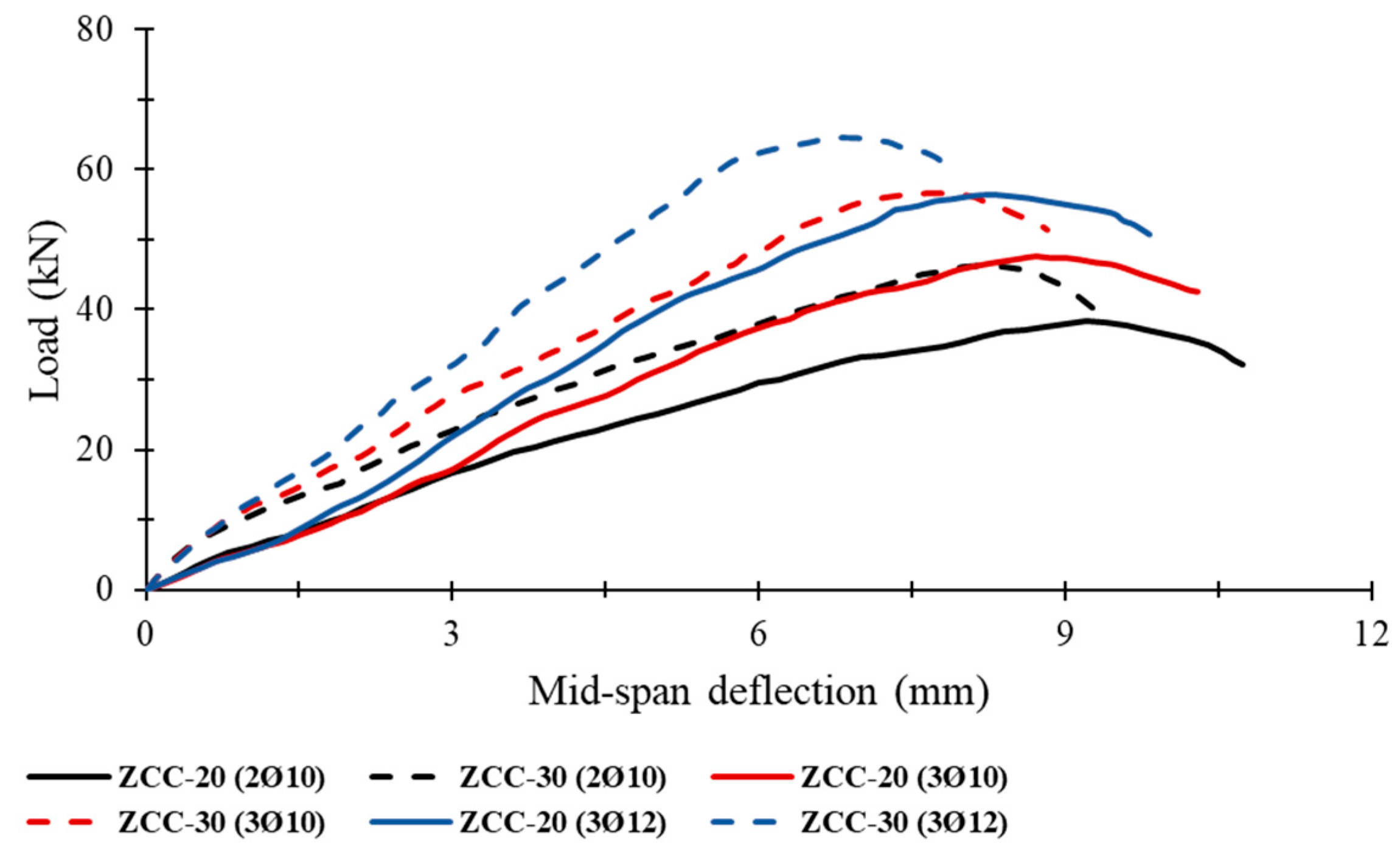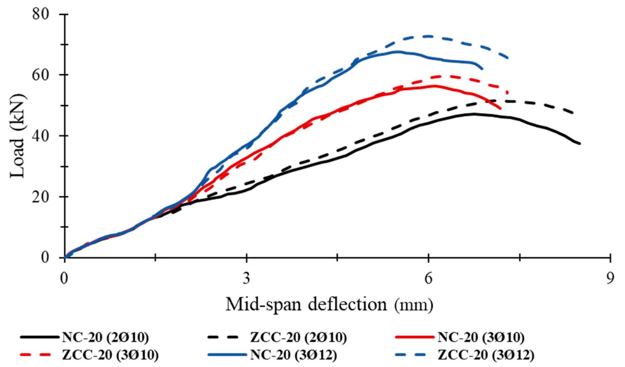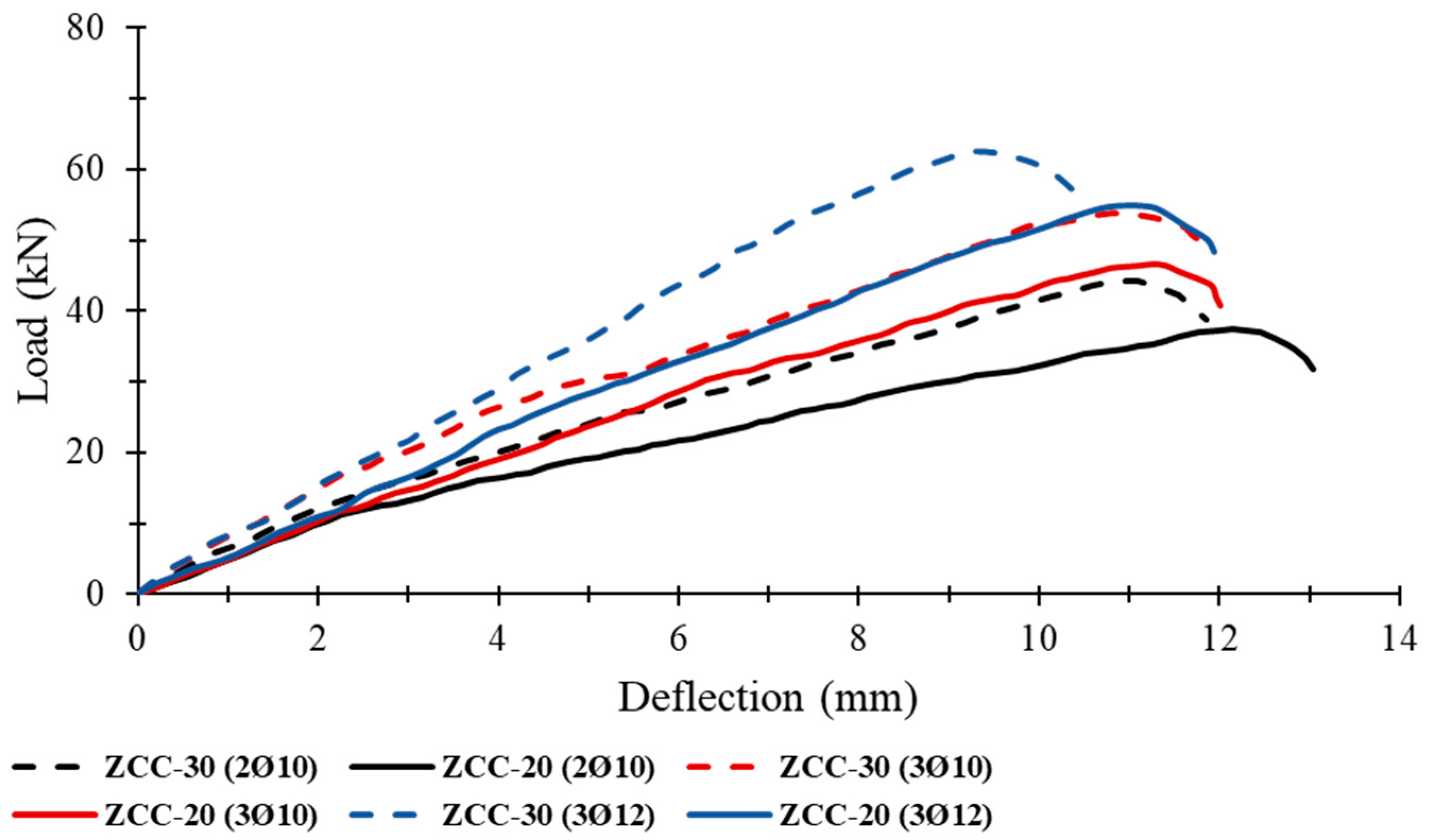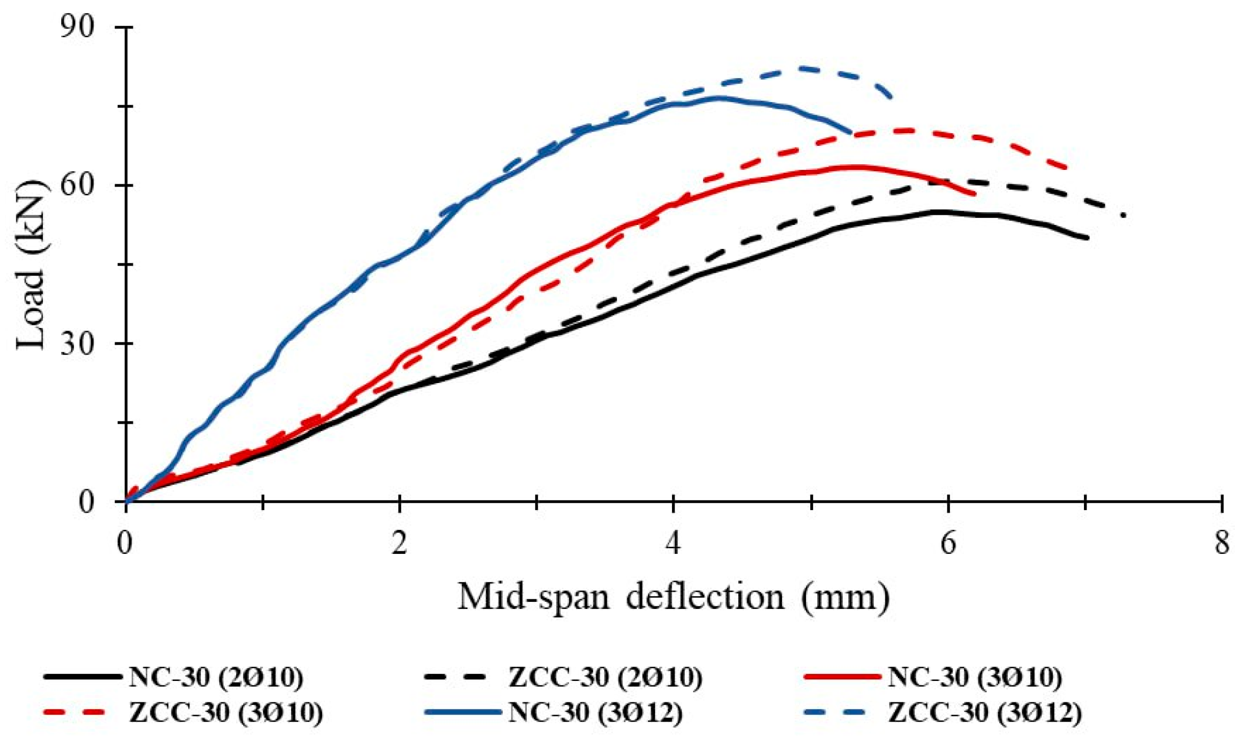 - ZCC beams maintained stable hysteresis loops and deformation capacity similar to that of NC beams. Ultimate loads were increased by 2–14%, while deflection was increased by 2–17%.