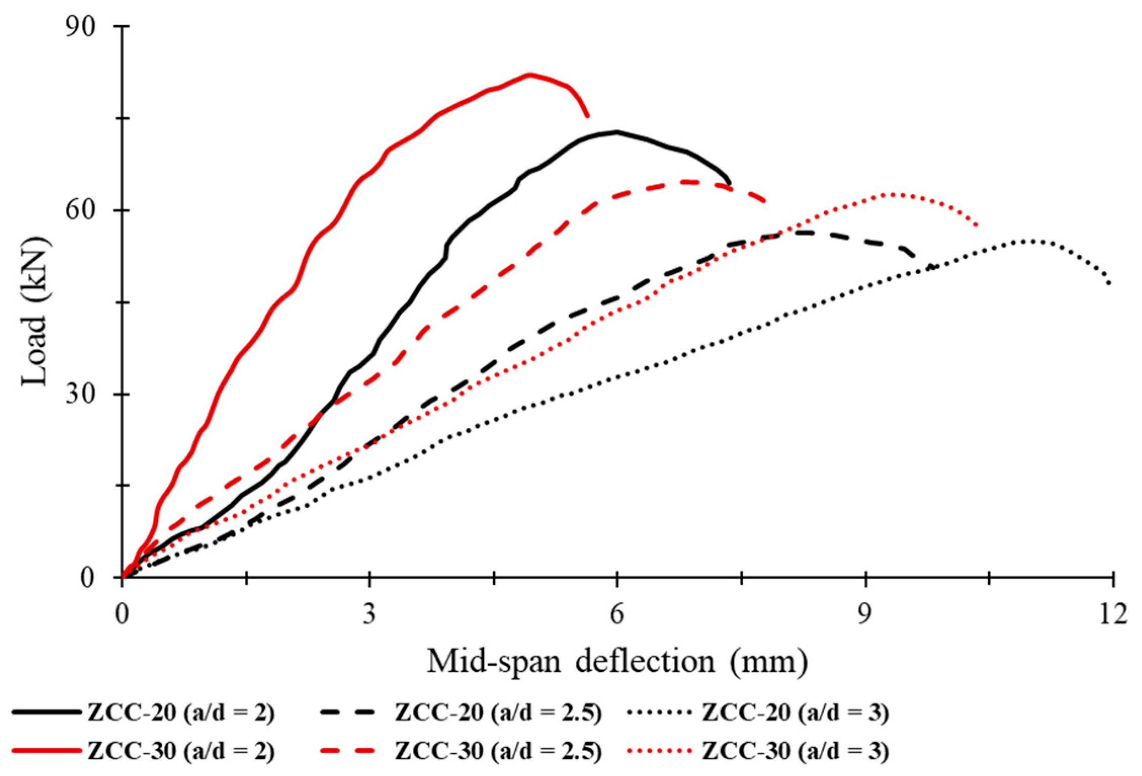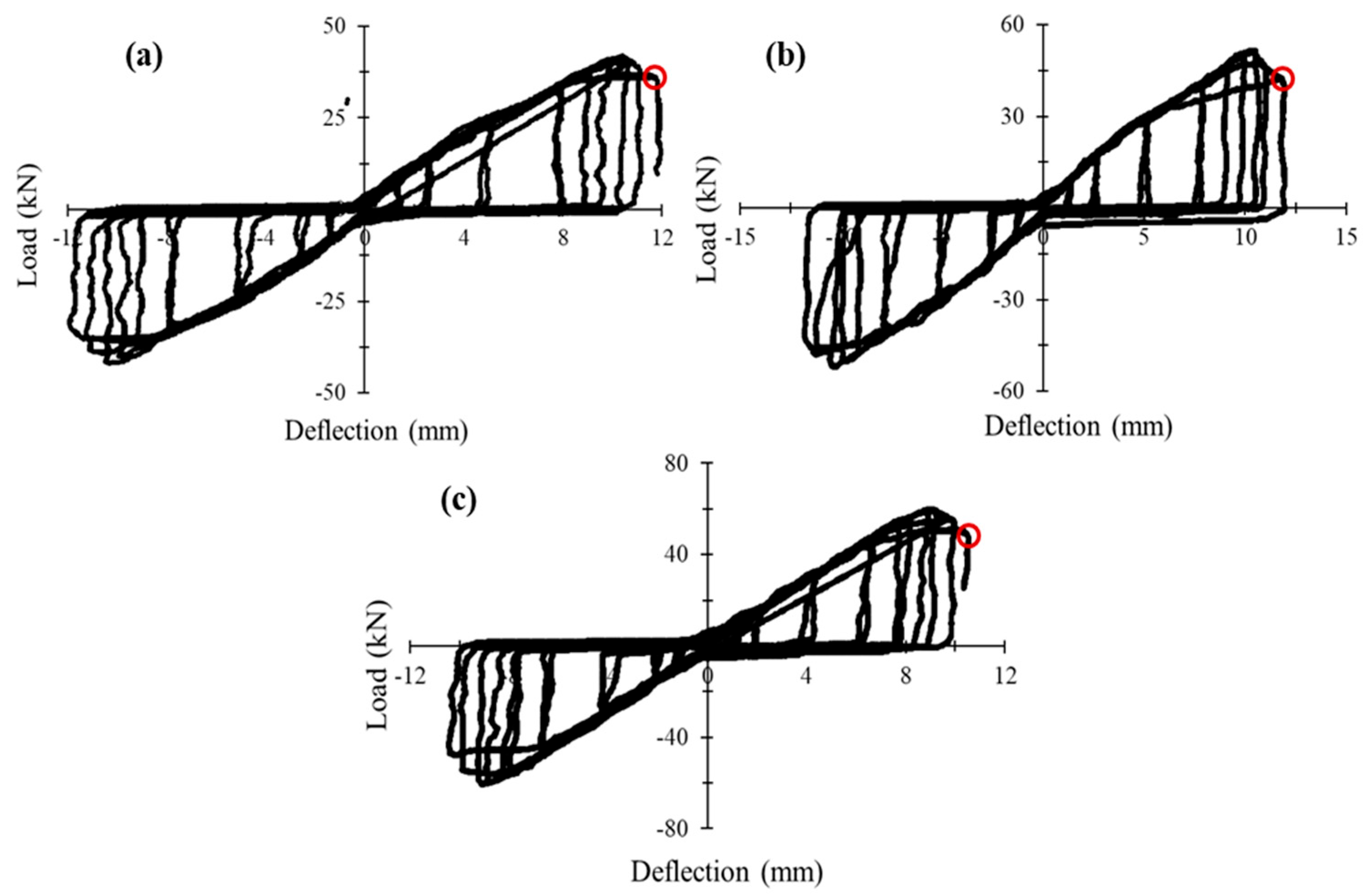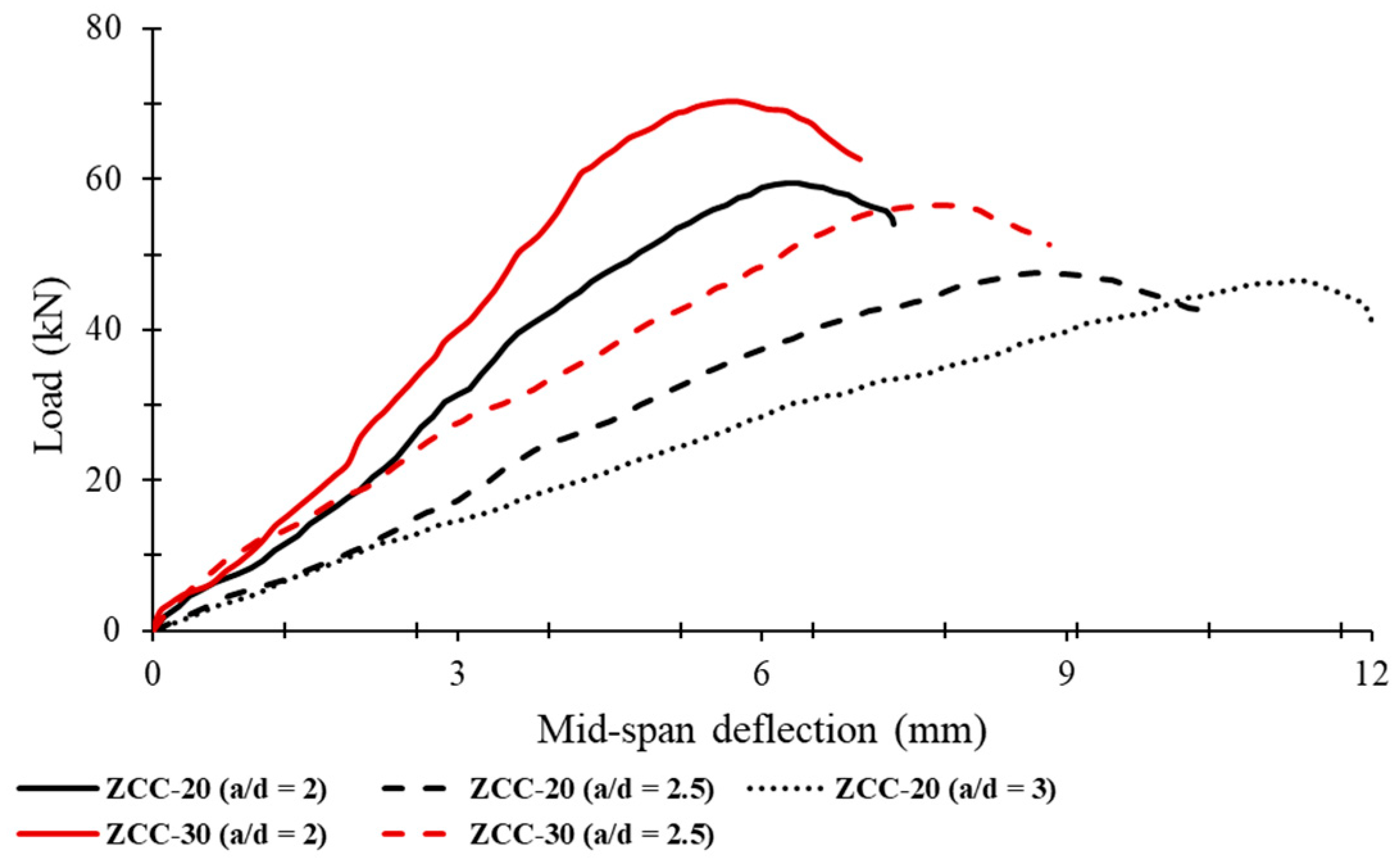 - Under cyclic loading, increasing the shear span-to-depth ratio (a/d = 2–3) reduced ultimate load capacity by 20–44% and increased deflection by 20–57%, reflecting a clear transition from shear-dominated to flexure-dominated response and greater susceptibility to fatigue-induced degradation.
