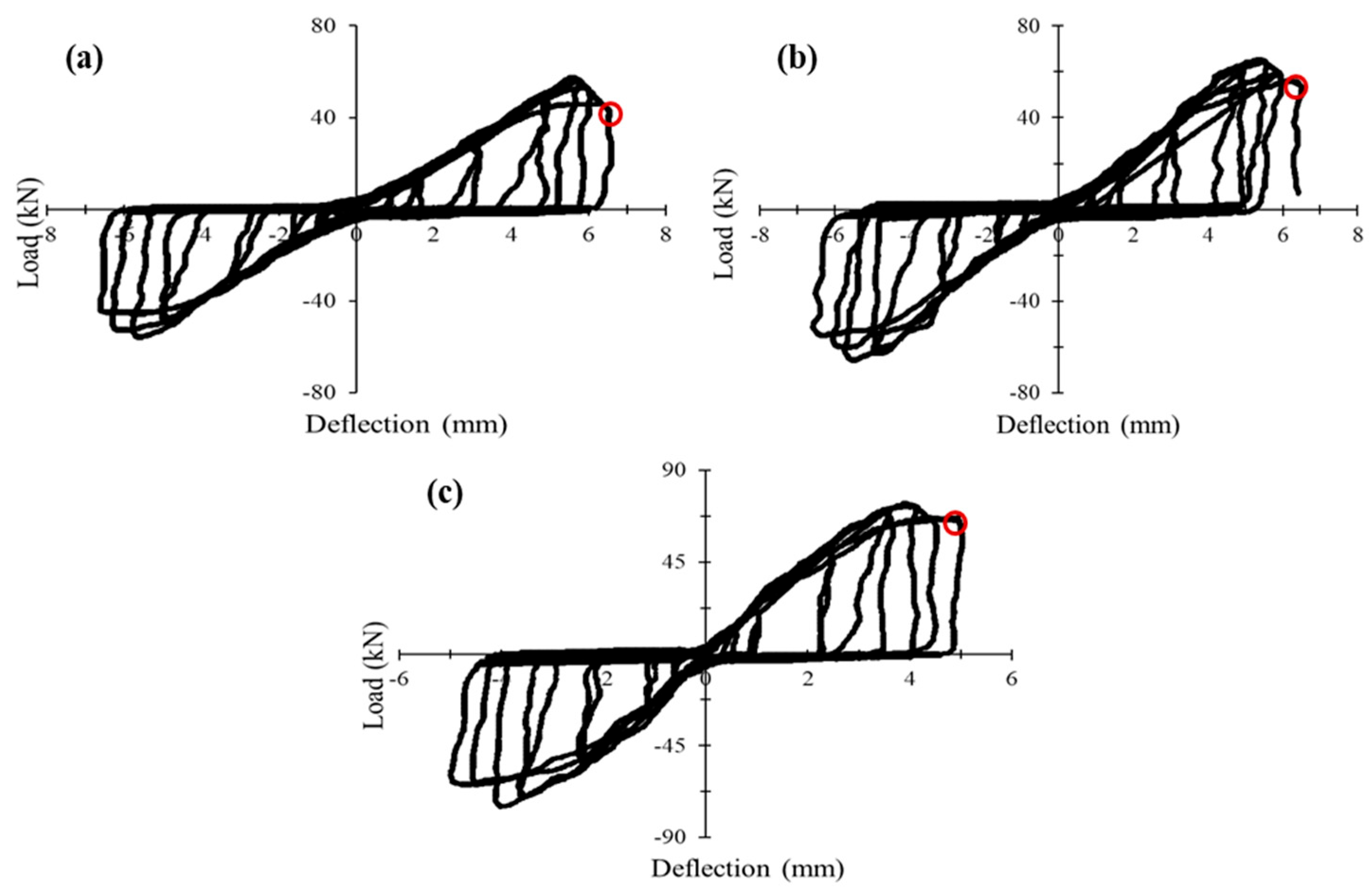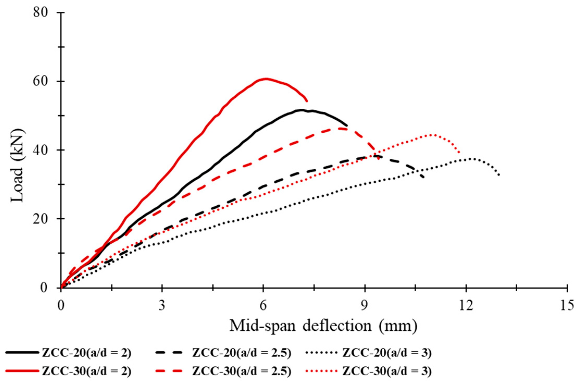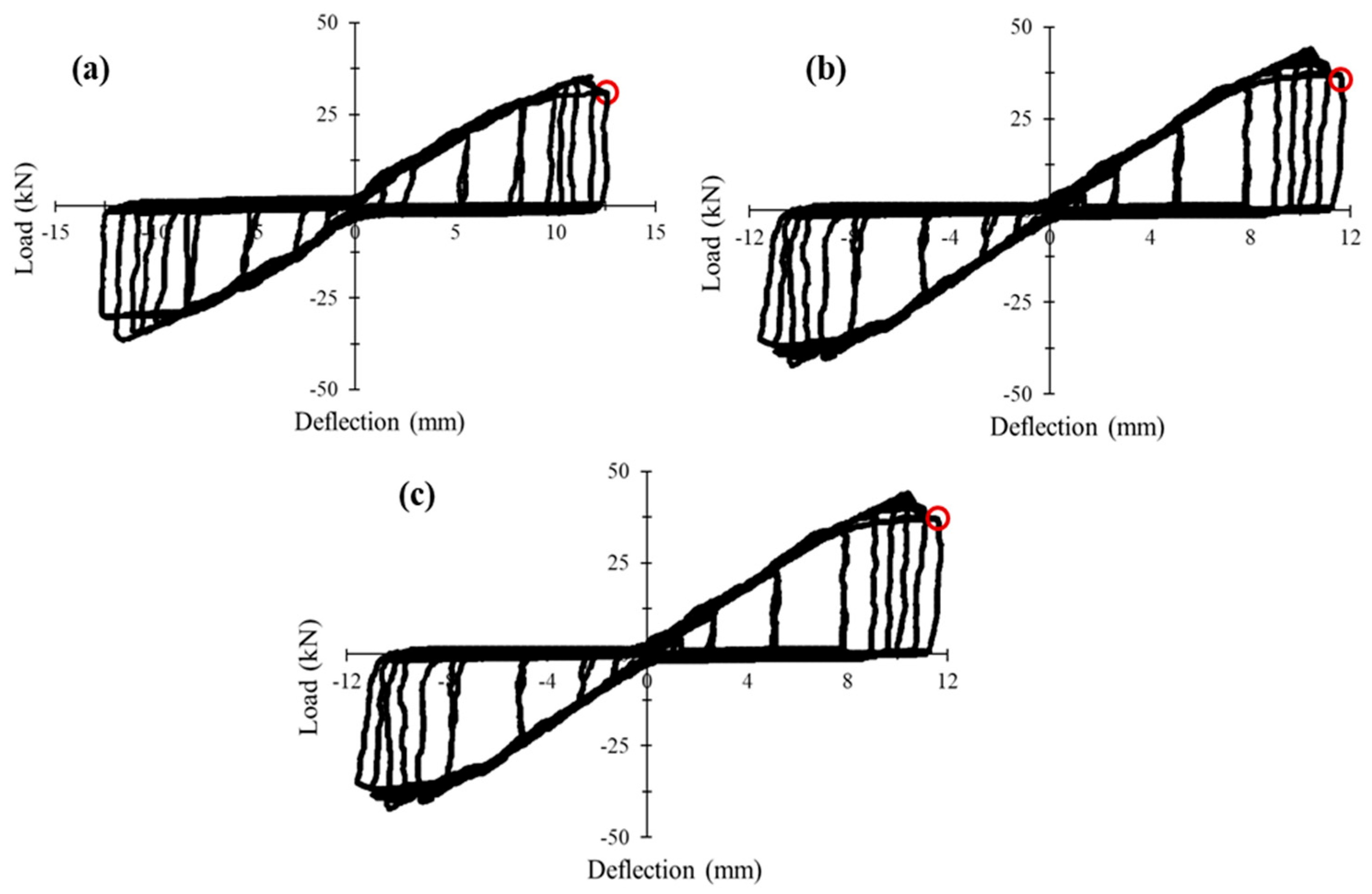 - Under cyclic loading, increasing the shear span-to-depth ratio (a/d = 2–3) reduced ultimate load capacity by 20–44% and increased deflection by 20–57%, reflecting a clear transition from shear-dominated to flexure-dominated response and greater susceptibility to fatigue-induced degradation.