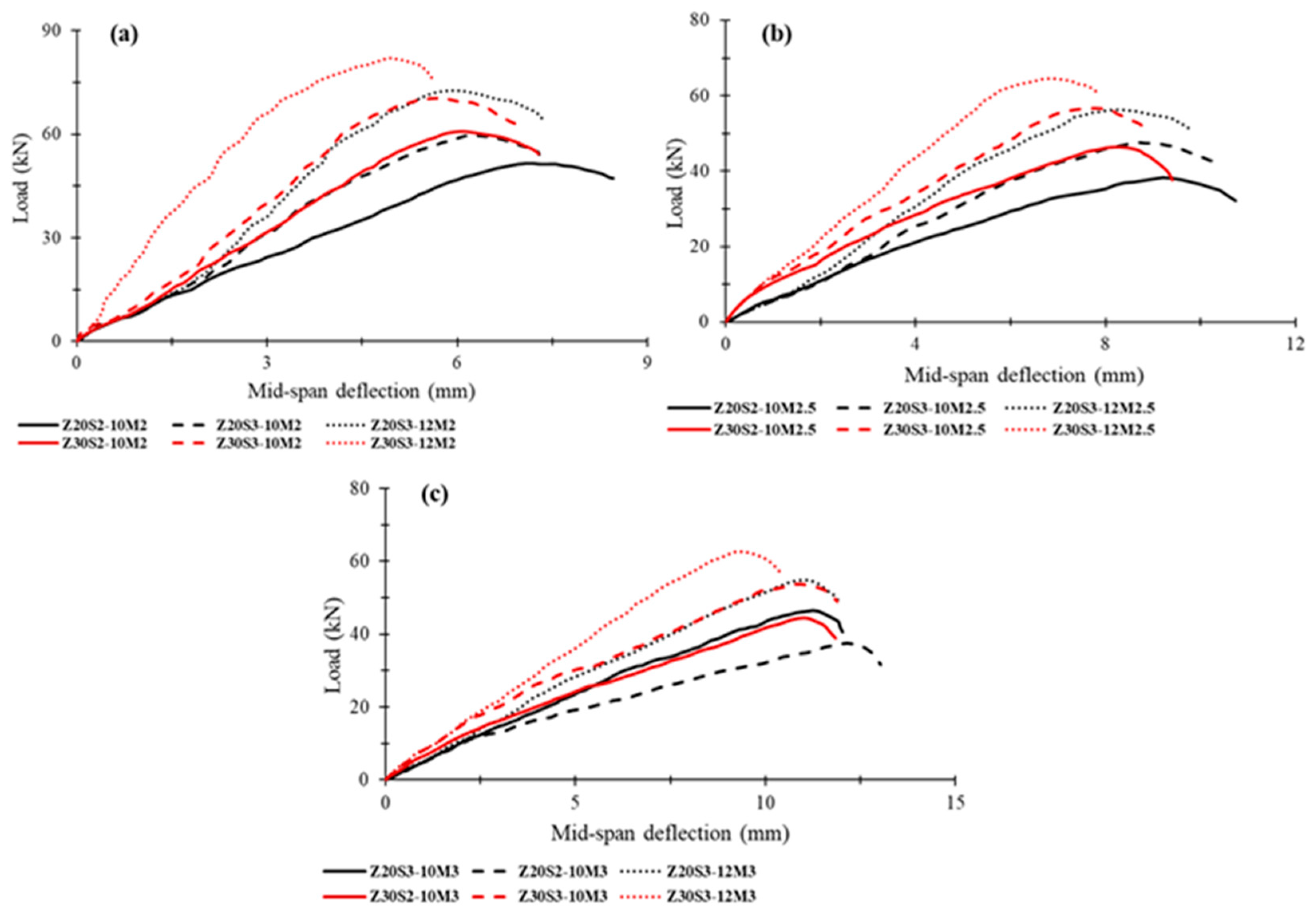 - Increasing compressive strength from 20 to 30 MPa enhanced load capacity by 12–17% and reduced deflection by 5–21%.