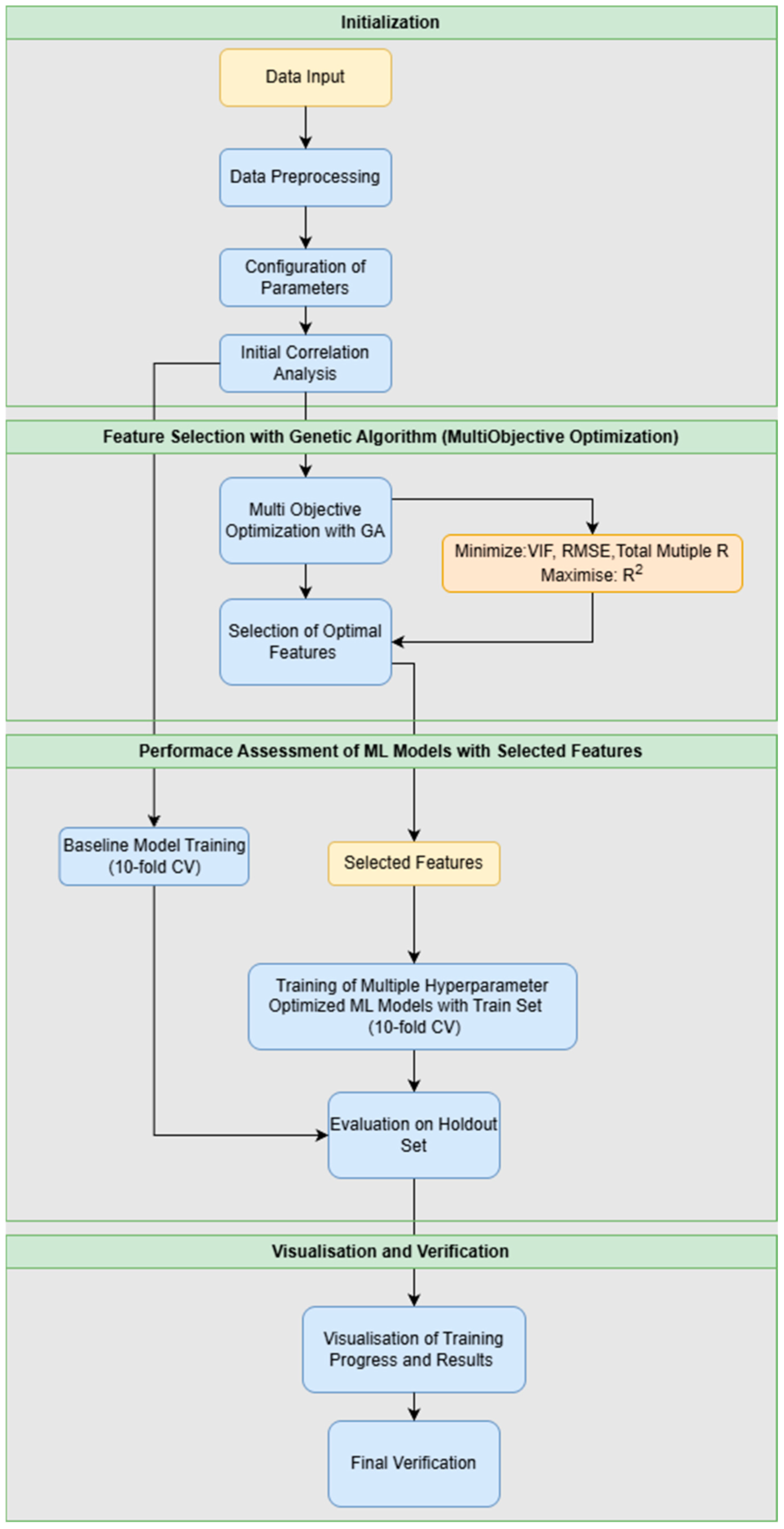 | 1. Load Data ├── Read CSV file ├── Handle missing values (dropna) ├── Apply StandardScaler normalization └── Extract dataset info (19 independent variables + 1 target) 2. Initial Correlation Analysis ├── Calculate Pearson correlation matrix ├── Generate correlation plot (heatmap) ├── Create correlation network plot (threshold = 0.7) └── Report correlation statistics 3. Genetic Algorithm Configuration ├── Set minimum variables (default: 5) ├── Configure GA parameters: │ ├── Population size (default: 60) │ ├── Generations (default: 40) │ ├── Crossover probability (default: 0.7) │ └── Mutation probability (default: 0.2) └── Set objective weights (VIF, R2, RMSE, Total R) 4. Genetic Algorithm(NSGA-II) Optimization (Run 12 Weight Combinations) ├── Initialize population (60 individuals, binary encoding) ├── For 40 generations: │ ├── Evaluate fitness (VIF, R2, RMSE, Total Multiple R) │ ├── Select with NSGA-II (Pareto ranking + crowding distance) │ ├── Crossover (prob = 0.7, two-point crossover) │ ├── Mutate (prob = 0.2, bit flip mutation) │ └── Update Pareto Front (Hall of Fame) └── Return Pareto optimal solutions 5. Pareto Front Analysis ├── Analyze all Pareto solutions ├── Find best solution for each objective ├── Calculate balanced scores using weighted normalization ├── Select optimal solution (maximizes balanced score) └── Variable count: Determined by GA results (typically 5–12) 6. Selected Variables Correlation Analysis ├── Calculate correlation for selected subset ├── Generate heatmap (selected variables only) ├── Create network plot (threshold = 0.7) └── Compare to baseline correlations 7. Baseline Evaluation (30 runs) ├── Calculate VIF for all 19 variables ├── Split data 80/20 train/test ├── Train Random Forest with k-fold CV ├── Evaluate on test set ├── Generate outputs: │ ├── VIF analysis plot │ ├── Predicted vs. true plots │ ├── Feature importance plot │ └── Baseline report (.txt) └── Purpose: Establish reference metrics before optimization 8. Training, Tuning and Evaluation of ML models(30 runs) ├── Extract selected features (N variables from GA) ├── Scale selected features (StandardScaler) ├── New Split: 80/20 train/test (Different from baseline split) ├── For each of 12–15 models: │ ├── Optimize hyperparameters (TPE, 50 evaluations) │ ├── k-fold CV on training set ONLY │ ├── Train final model on training set │ └── Evaluate on holdout test set ├── Create predicted vs. true grid for all models ├── Intelligent feature importance plotting: │ ├── Try best model first │ ├── If unsupported, try 2nd best, 3rd best, etc. │ └── Plot from first model that supports it ├── Rank models by test set R2 └── Print performance summary table 9. Final Analysis and Visualization ├── Print Final Model Performance and Ranking: │ ├── Display All models │ ├── Show holdout test metrics: R2_Test, RMSE_Test, MAE_Test │ ├── Include CV metrics for comparison: R2_CV, RMSE_CV │ ├── Best model selected by R2_Test (holdout performance) │ └── Generalization assessment: ΔR2 = |R2_Test − R2_CV| ├── Plot GA convergence (4 objectives over 40 generations) ├── Plot Pareto front (4 views of trade-offs) ├── Plot feature importance for BEST model (by R2_Test) └── Compare baseline vs. final performance 10. Final Verification (embedded in Step 8) ├── Calculate final VIF values ├── Assess multicollinearity reduction ├── Report variable reduction percentage ├── Compare baseline vs. final metrics (R2, RMSE) └── Summary statistics and conclusions |