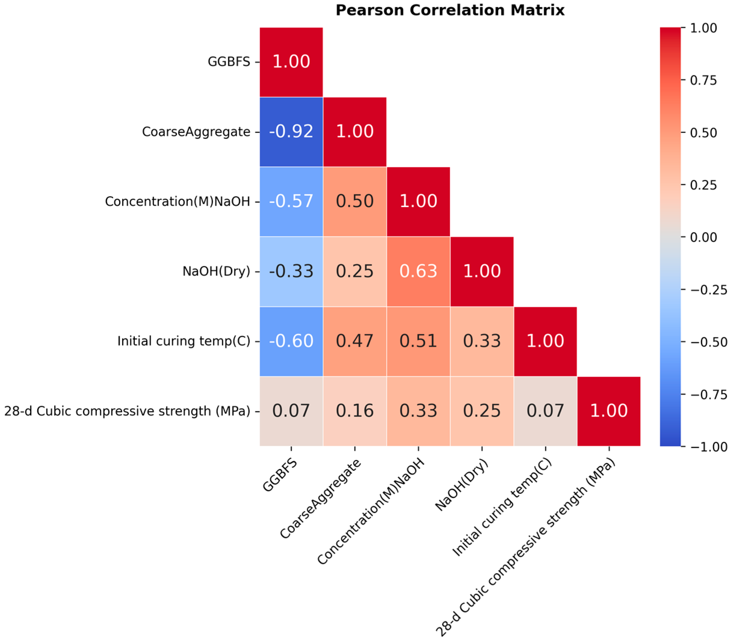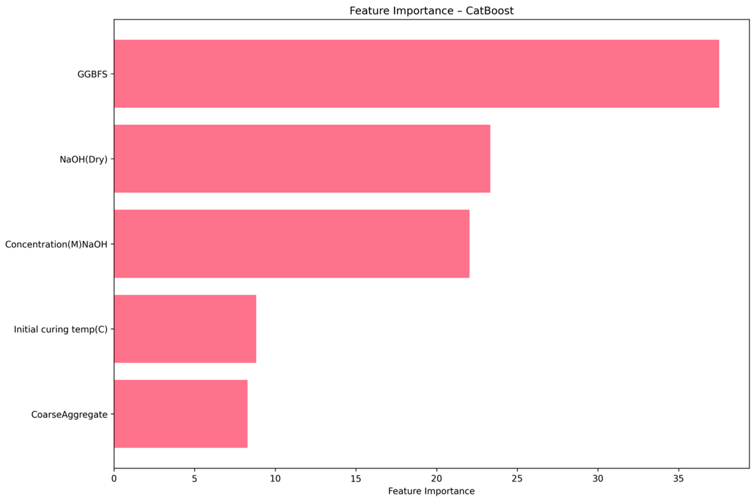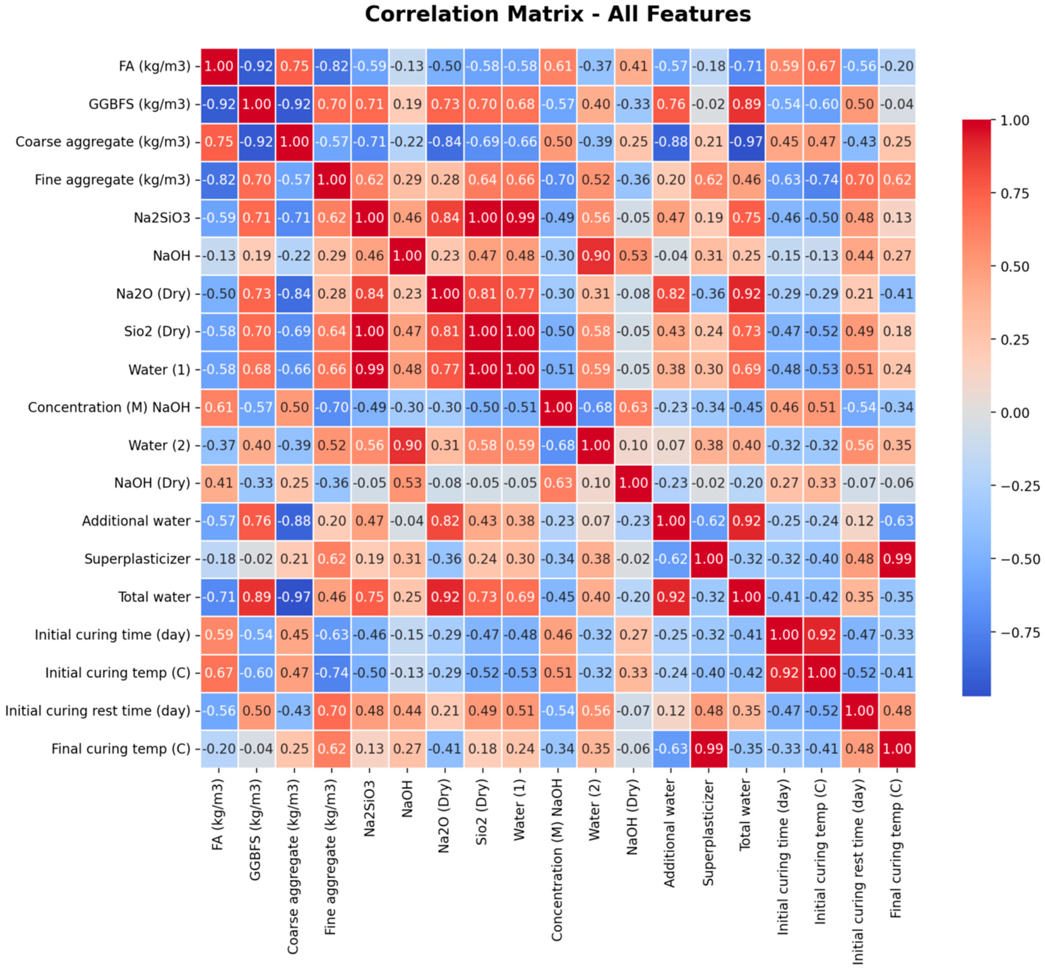 | Present Study | 274 experimental records covering 19 variables (FA, GGBFS, Na2SiO3, NaOH, curing parameters, aggregates, water, SP, etc.). | Data preprocessing, correlation and network analysis, VIF calculation, multi-objective GA for feature selection, hyperparameter tuning; models: RF, XGBoost, LightGBM, CatBoost, SVR, MLP, etc. | Best performance achieved with CatBoost (R2 = 0.9583). GGBFS identified as most influential feature; NaOH (Dry) is also critical for estimation. |