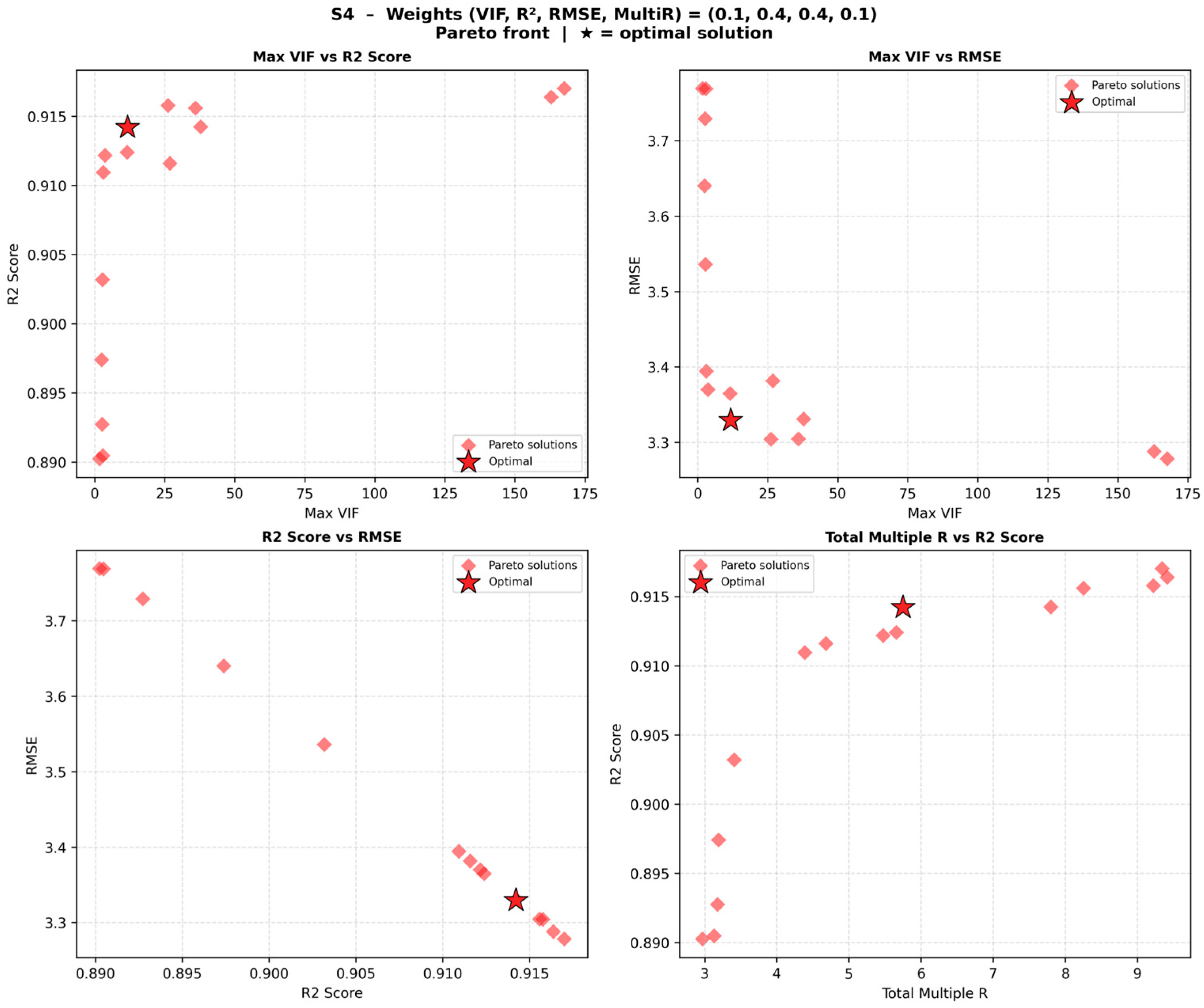 | Scenario | Weights (VIF, R2, RMSE, MultiR) | N Vars | Max VIF of Solution | R2 | RMSE | Total Multi-R |