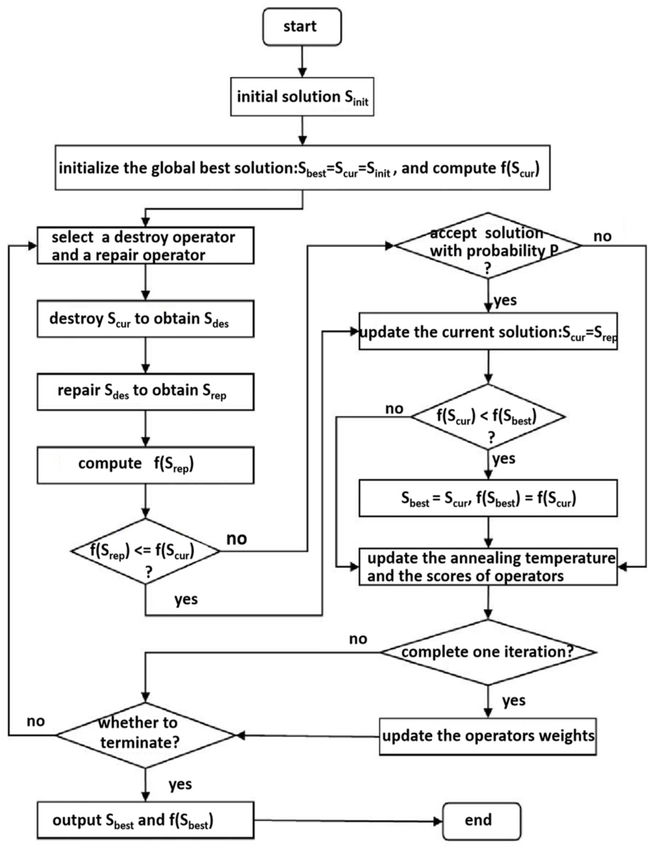 | Input: initial solution , destroy operator set , repair operator set , cooling rate , initial temperature |
