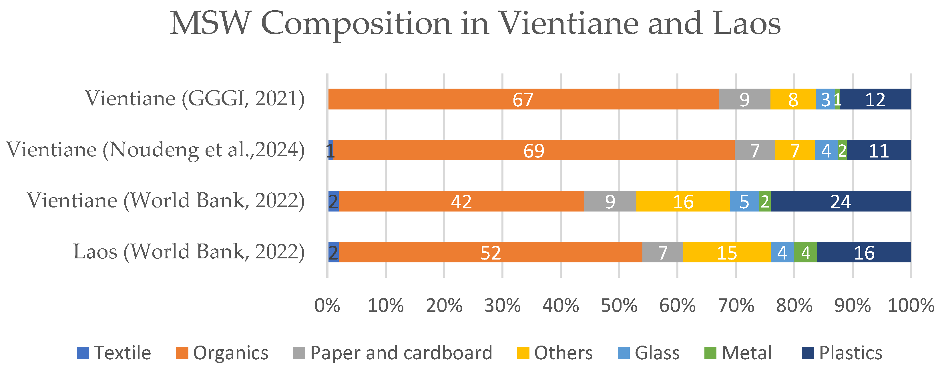 | Vientiane | 2018 | 665,000 | 219,000 | 329 | 12 | 36 | 24,090 | GGGI, 2018 [32] | Overall waste report |