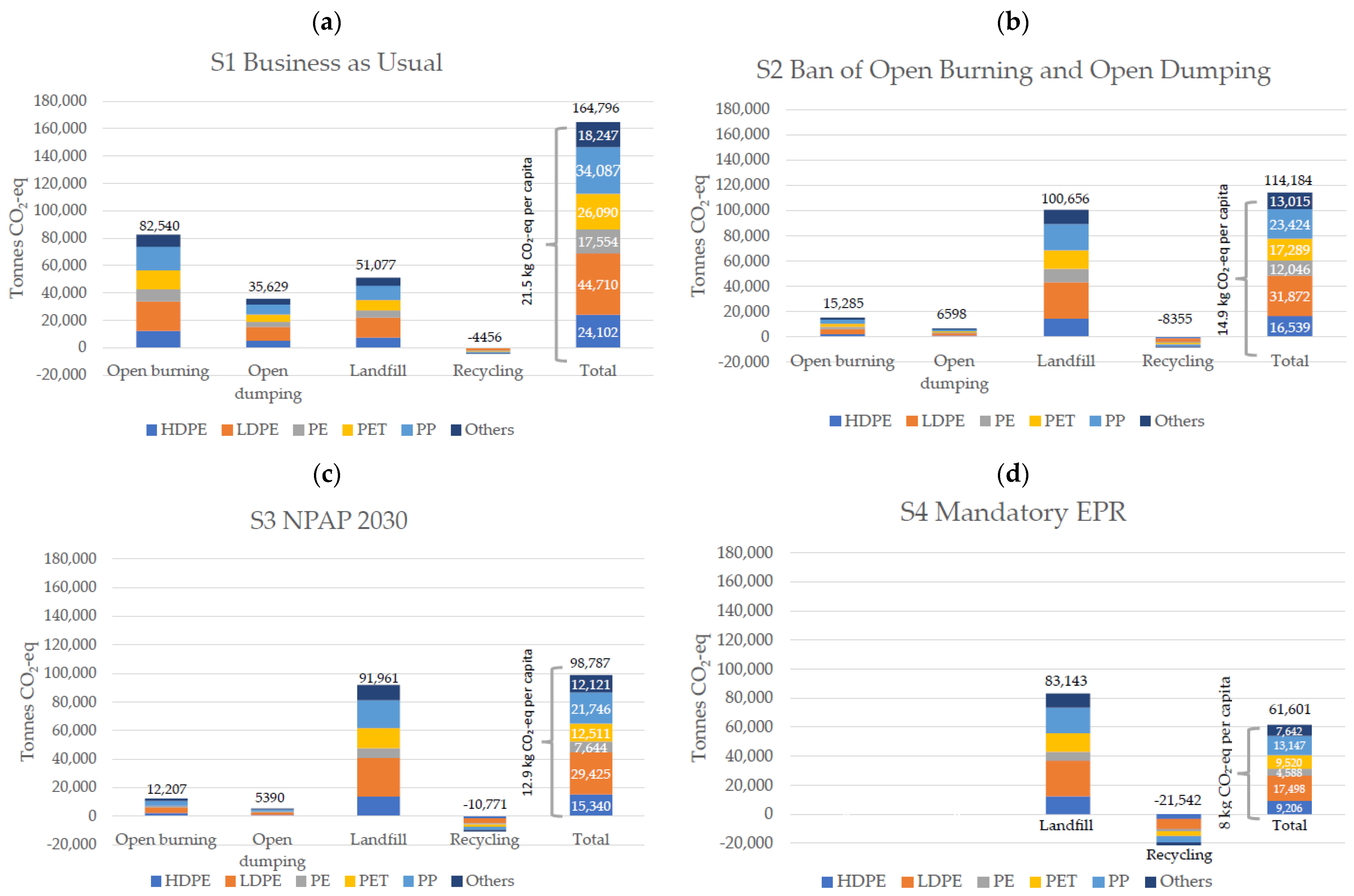 - S4 Mandatory Extended Producer Responsibility (EPR) represents the implementation of mandatory EPR for plastic packaging. As in S3, 31.6% upstream reduction in plastic bags is applied, reflecting the prevention incentives embedded in EPR schemes. For the remaining waste, open burning and open dumping are eliminated, assuming nationwide formalisation of collection under mandatory EPR. Recycling increases to 40%, aligned with the average plastic packaging recycling rate observed in EU member states following EPR implementation [48]. The remaining 60% is directed to landfilling, reflecting the current technological constraints in Laos and the absence of alternative treatment options.