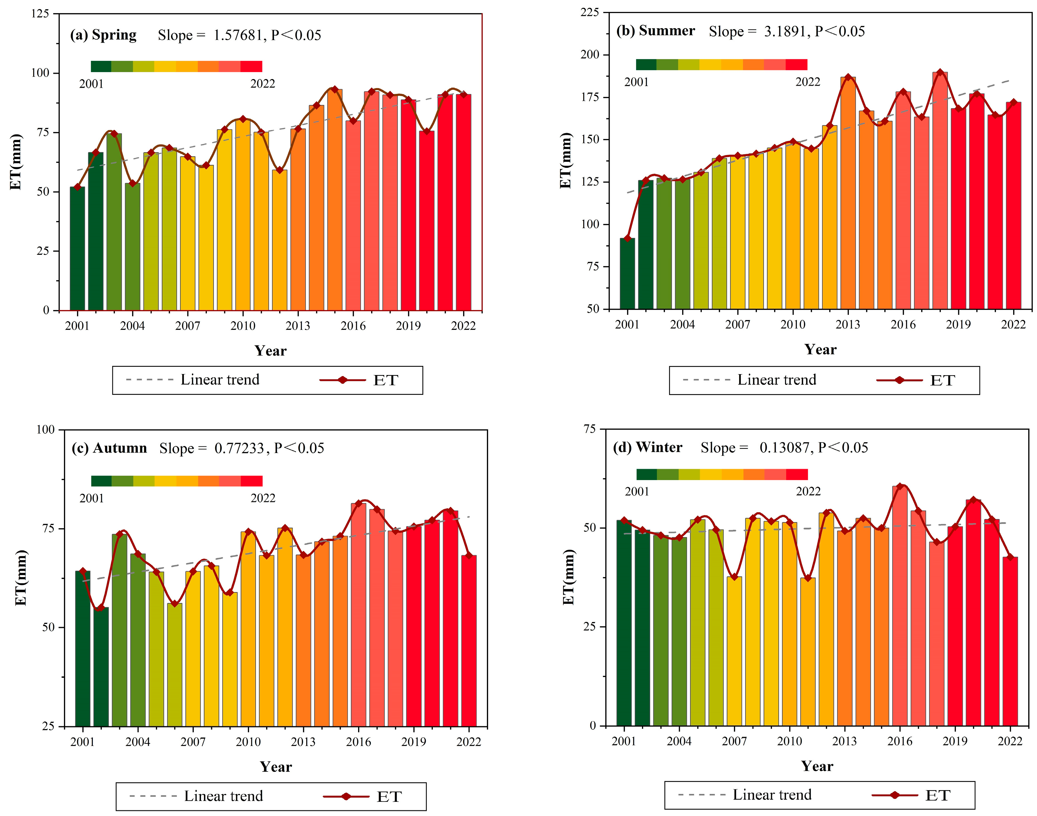 - Yusupukadier, Z.; Zhang, T.; Yang, M.; Liu, Y.; Wang, Z.; Wen, Z. Characteristics and drivers of spatial and temporal evolution of evapotranspiration and components in four major climate zones in China, 1982–2021. Acta Ecol. Sin. 2025, 45, 7780–7792. [Google Scholar] [CrossRef]