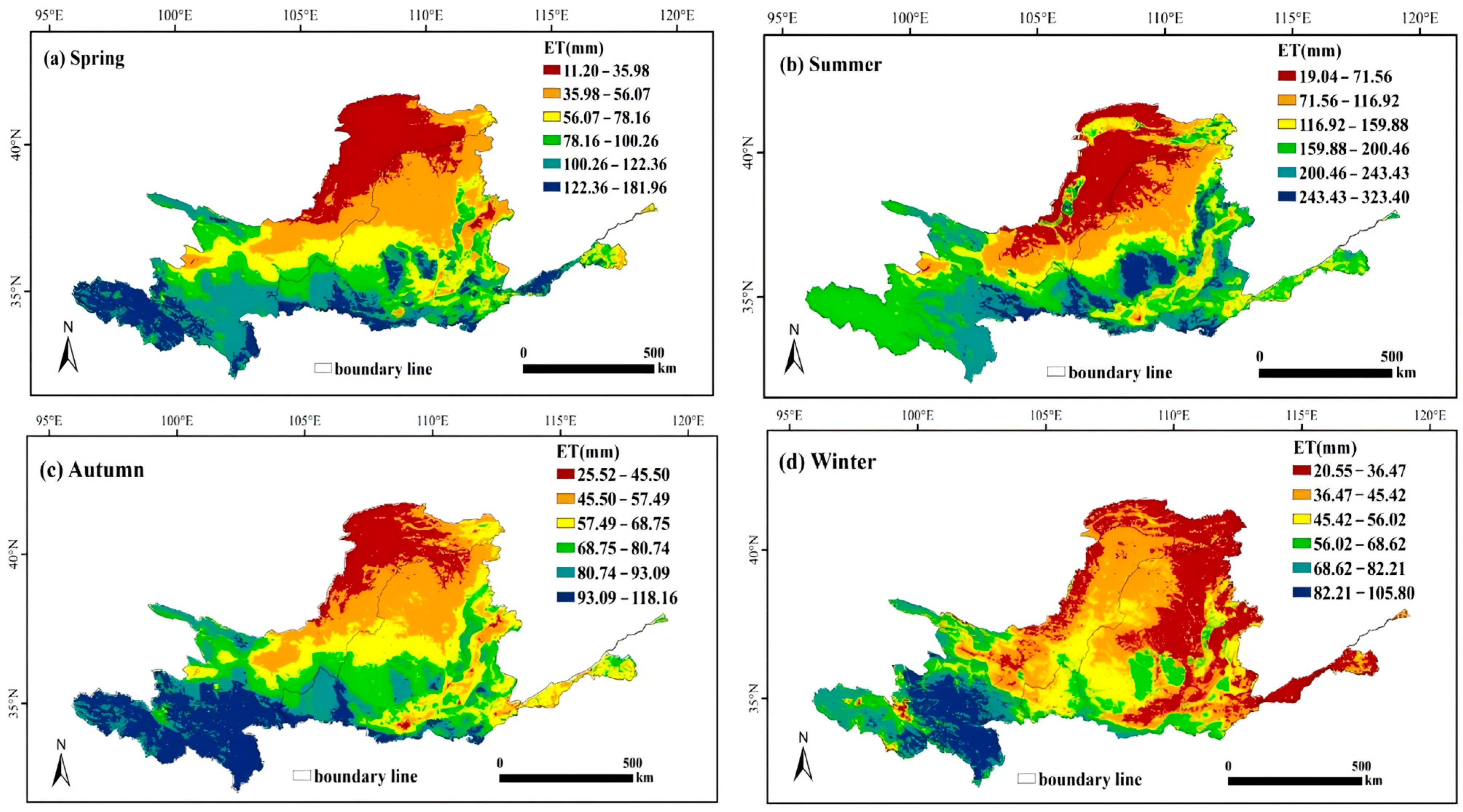 - Pei, T.; Wu, X.; Li, X.; Zhang, Y.; Shi, F.; Ma, Y.; Wang, P.; Zhang, C. Seasonal divergence in the sensitivity of evapotranspiration to climate and vegetation growth in the Yellow River Basin, China. J. Geophys. Res. Biogeosci. 2017, 122, 103–118. [Google Scholar] [CrossRef]
