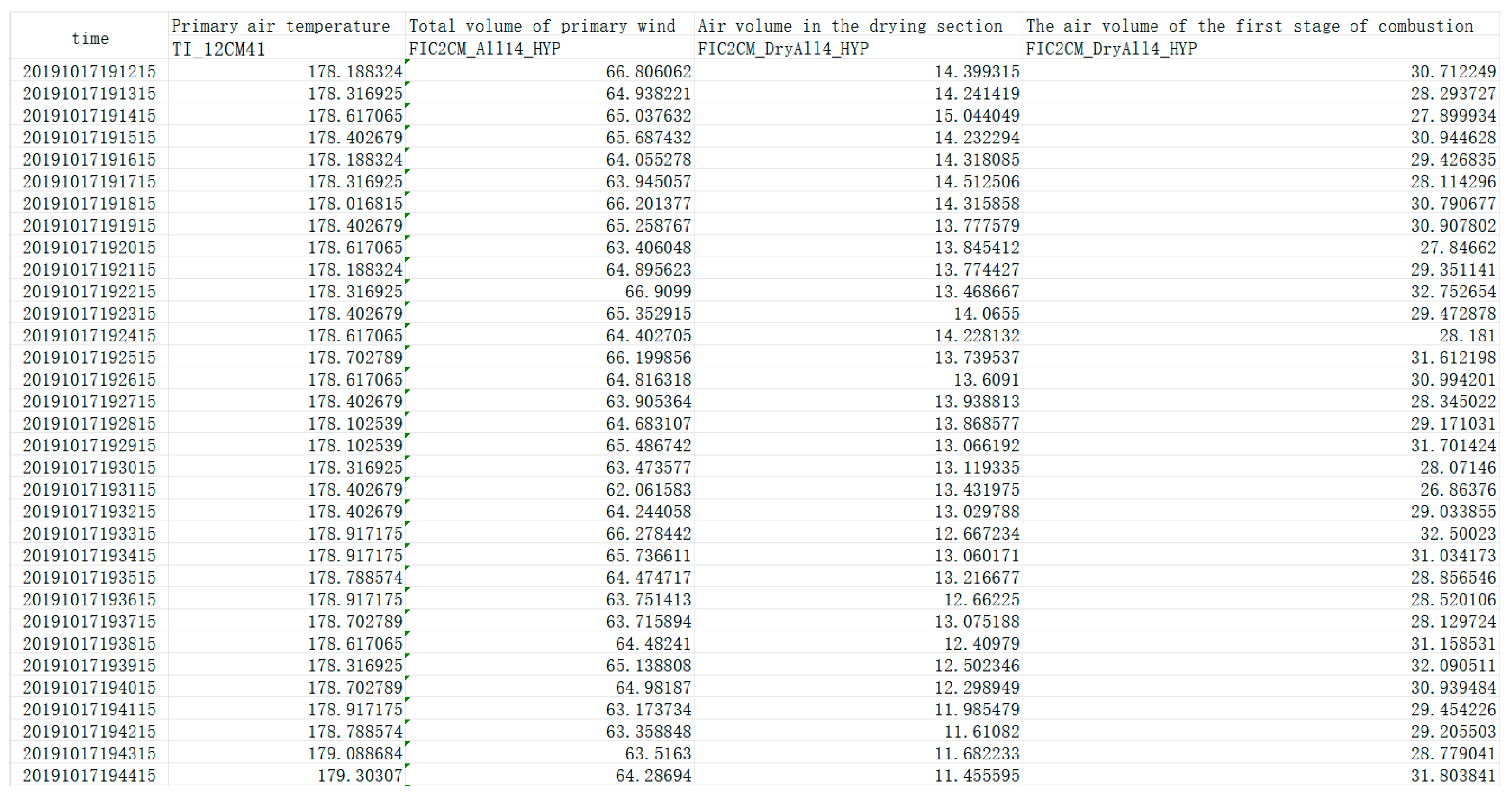 | Grate speed in the drying zone | The left inner drying grate velocity, the left outer drying grate velocity, the right inner drying grate velocity, and the right outer drying grate velocity | Take the mean value |