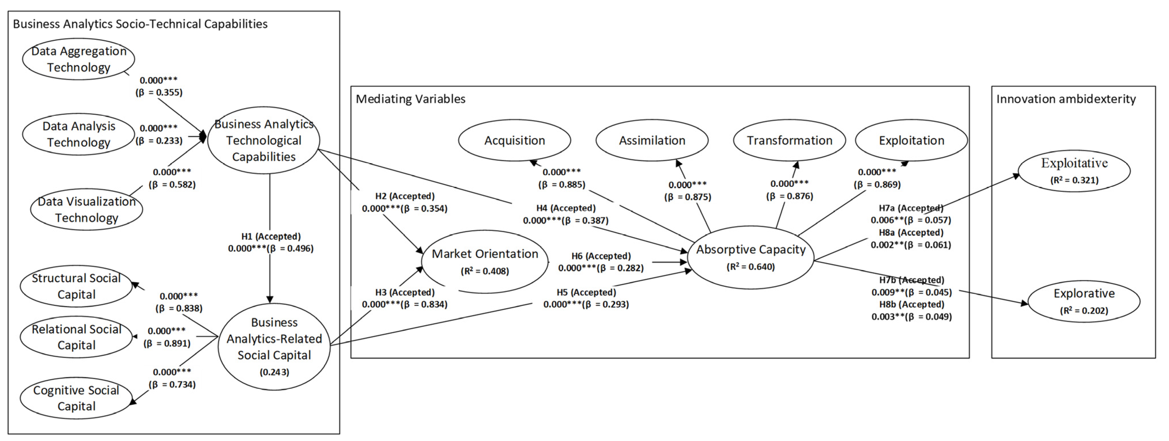2.4. The Impact of Business Analytics Technological Capabilities and Social Capital on Absorptive Capacity
