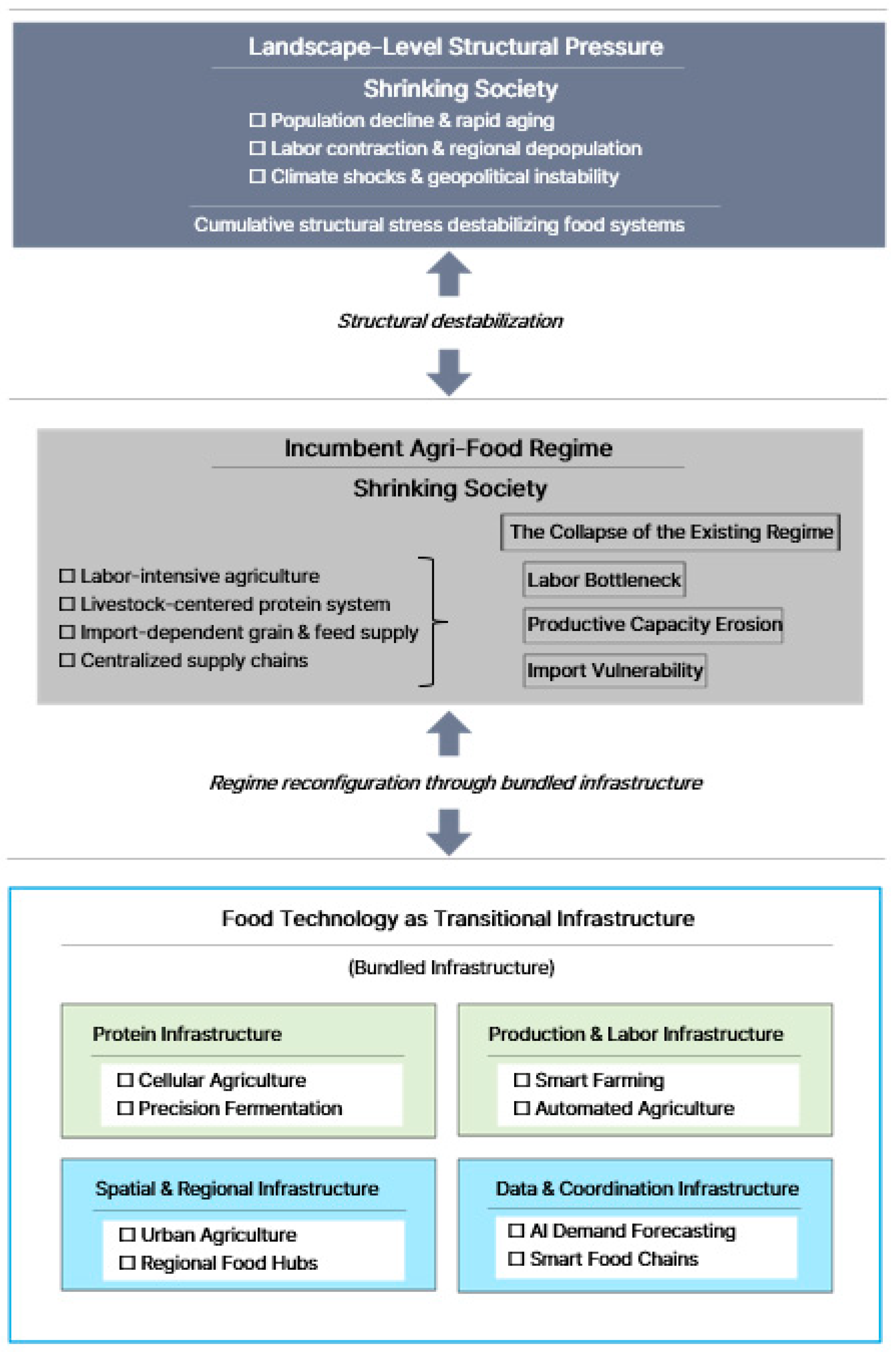 The academic contributions of this study are threefold. First, it reconceptualizes demographic shrinkage not as an exogenous background variable but as a landscape-level structural pressure that destabilizes incumbent agri-food regimes. Second, it theorizes food technology as transitional infrastructure, rather than as a collection of isolated innovations or industrial policy instruments. Third, it reframes food security from a narrow concern with production and imports into a broader question of systemic resilience, governance integration, and intergenerational justice.