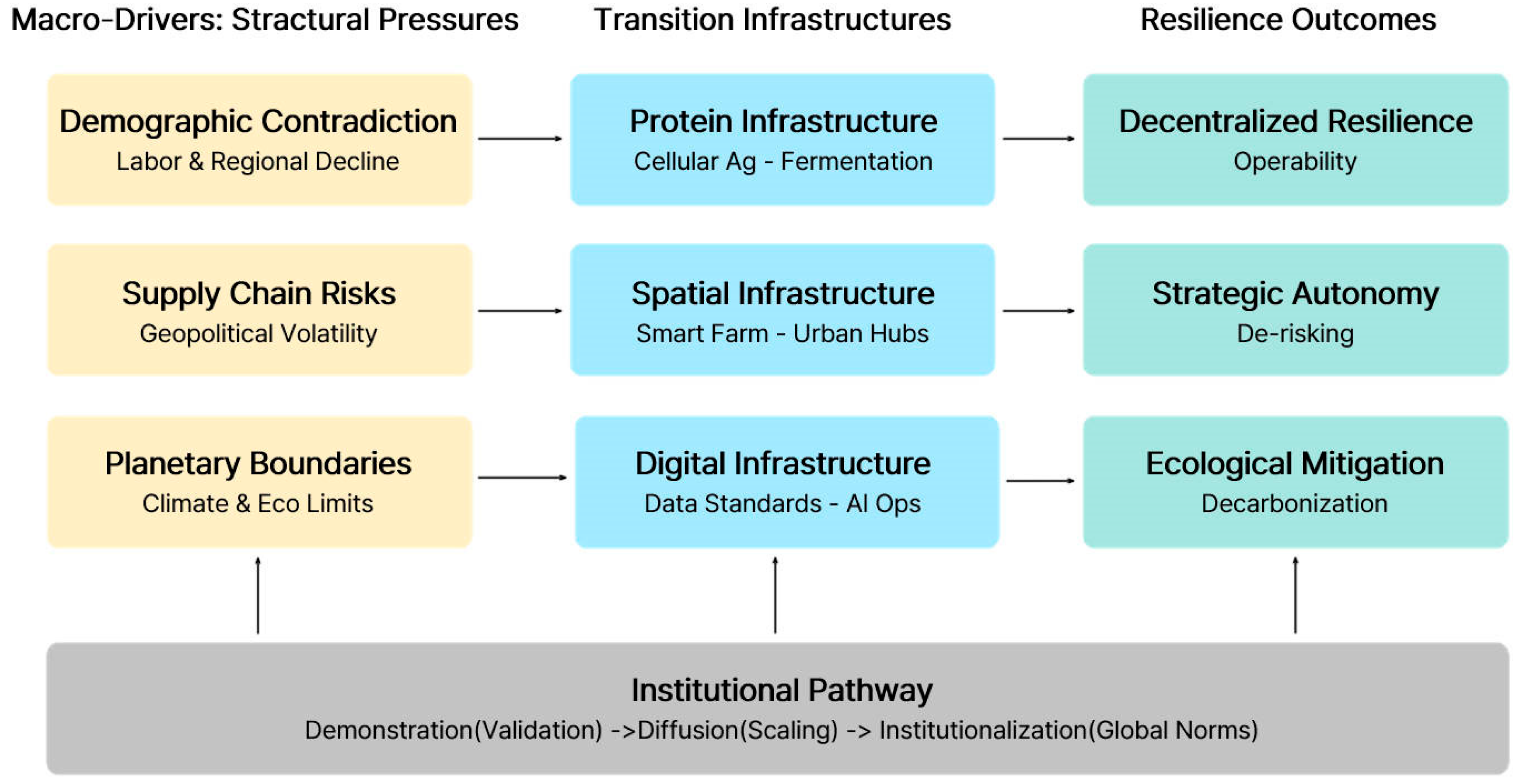 42]. Under conditions of population decline, aging, labor scarcity, and geopolitical uncertainty, food security can no longer be sustained through production growth or trade diversification alone. Instead, it must be reconceptualized as a problem of systemic resilience, transitional infrastructure, and integrated governance.
