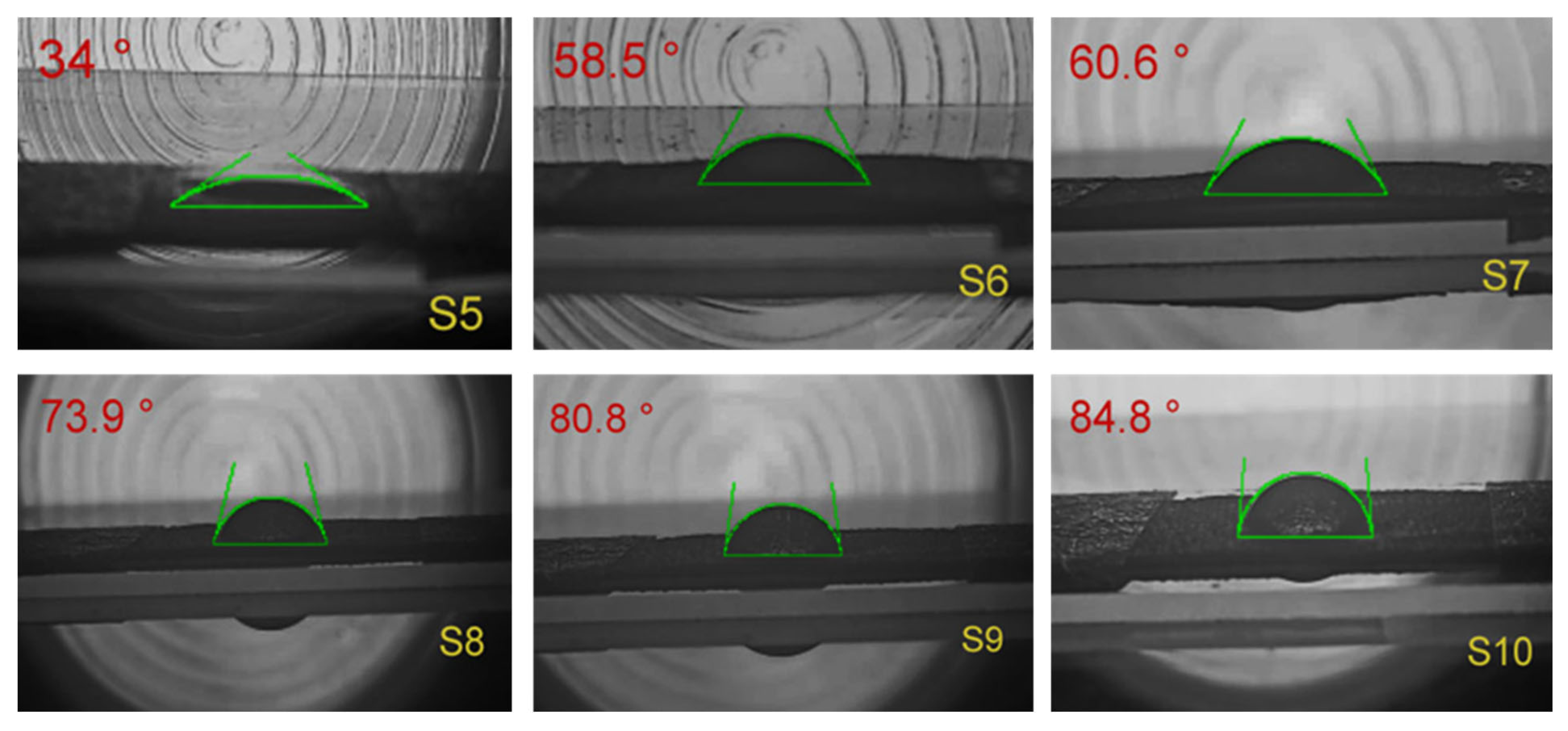 2.5.5. Contact Angle Measurement and Water Absorbency (Drop Test)