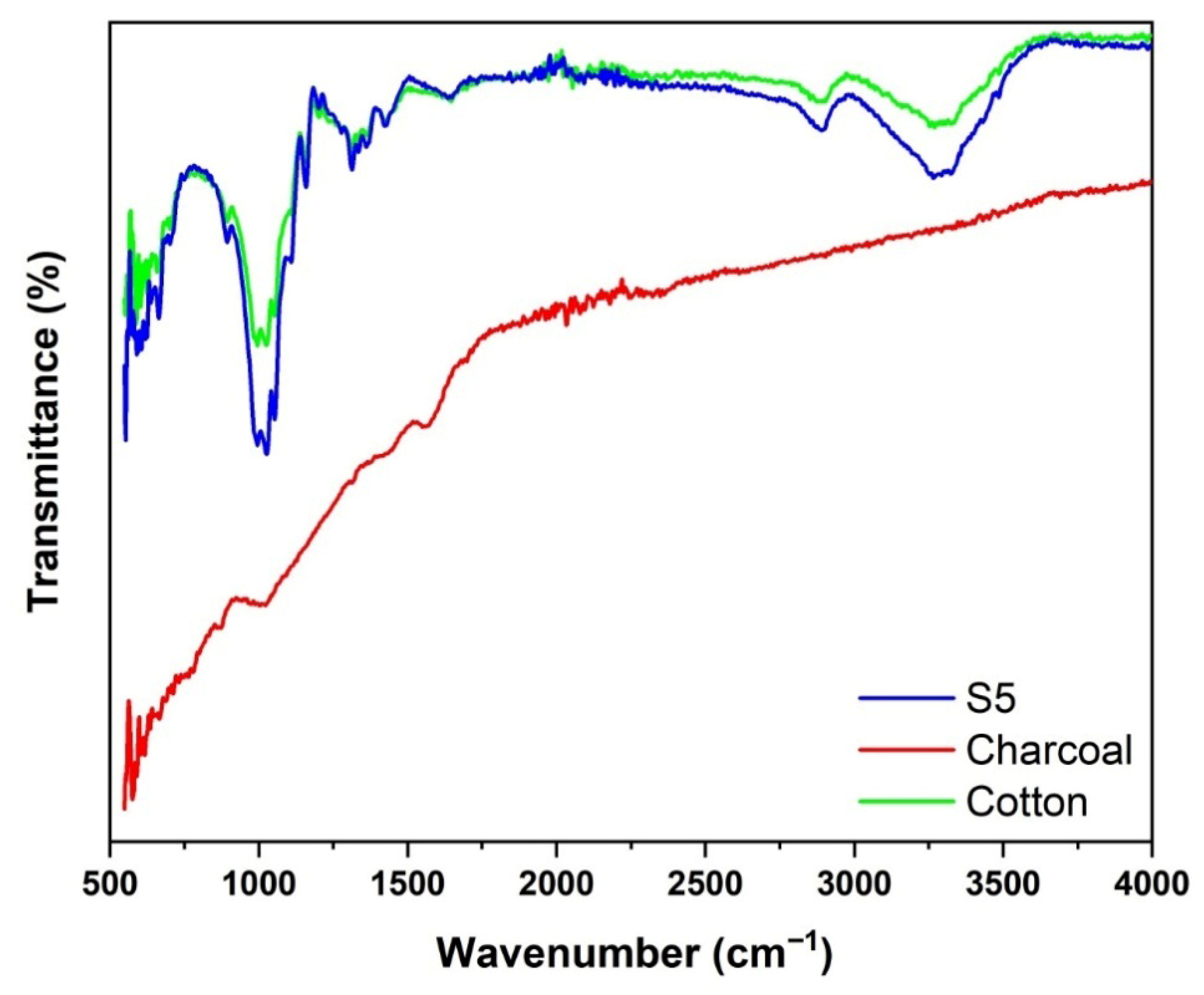 - The S5 sample (cotton printed with charcoal) exhibits a hybrid spectral profile that combines characteristics of charcoal and cotton cellulose, indicating that the surface treatment was successful. In particular: