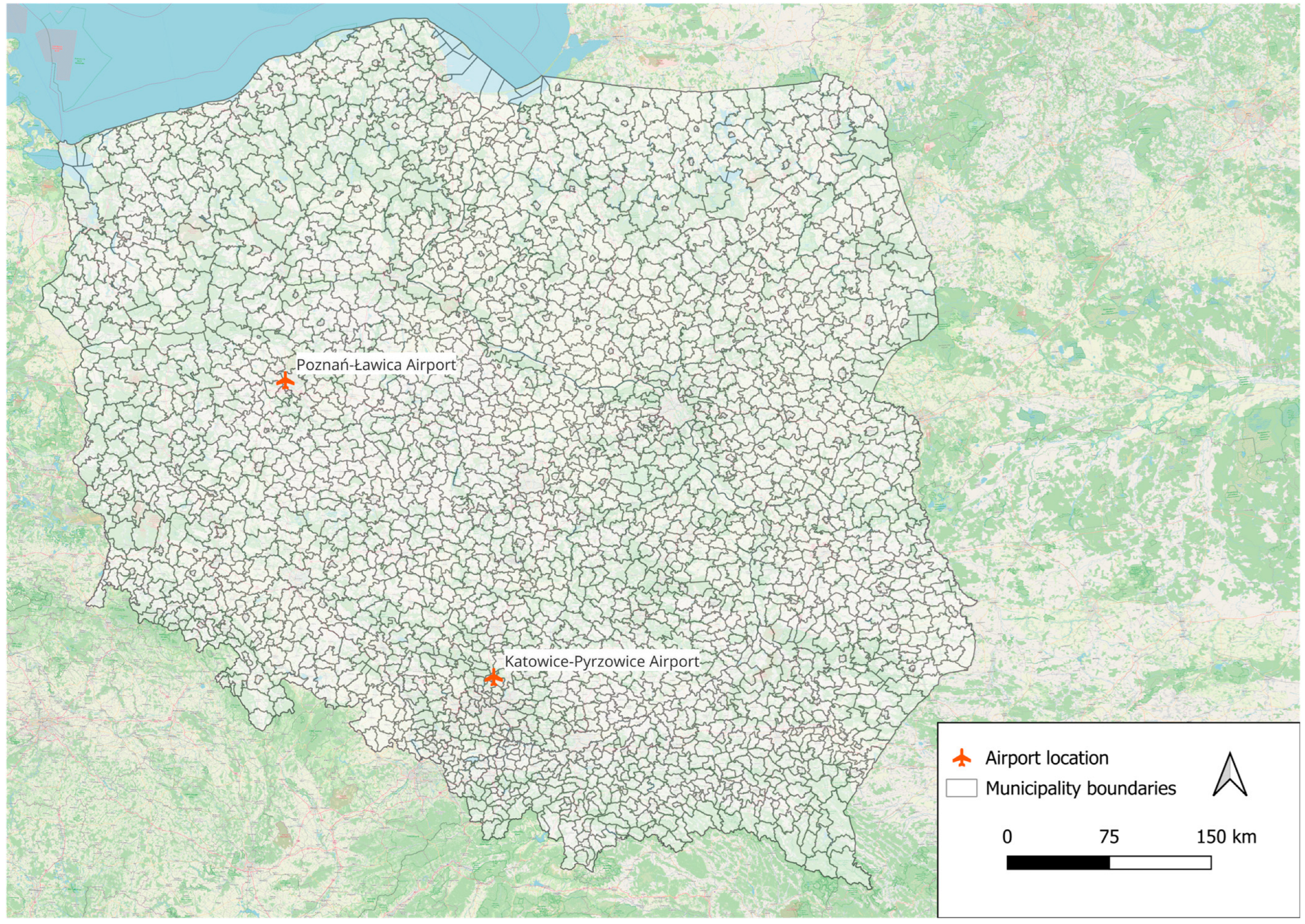 Figure 2 presents the geographical location of both airports against the background of Poland’s administrative division, specifically municipality boundaries. Katowice Airport serves the densely populated Silesian agglomeration, while Poznań-Ławica serves the Greater Poland region.