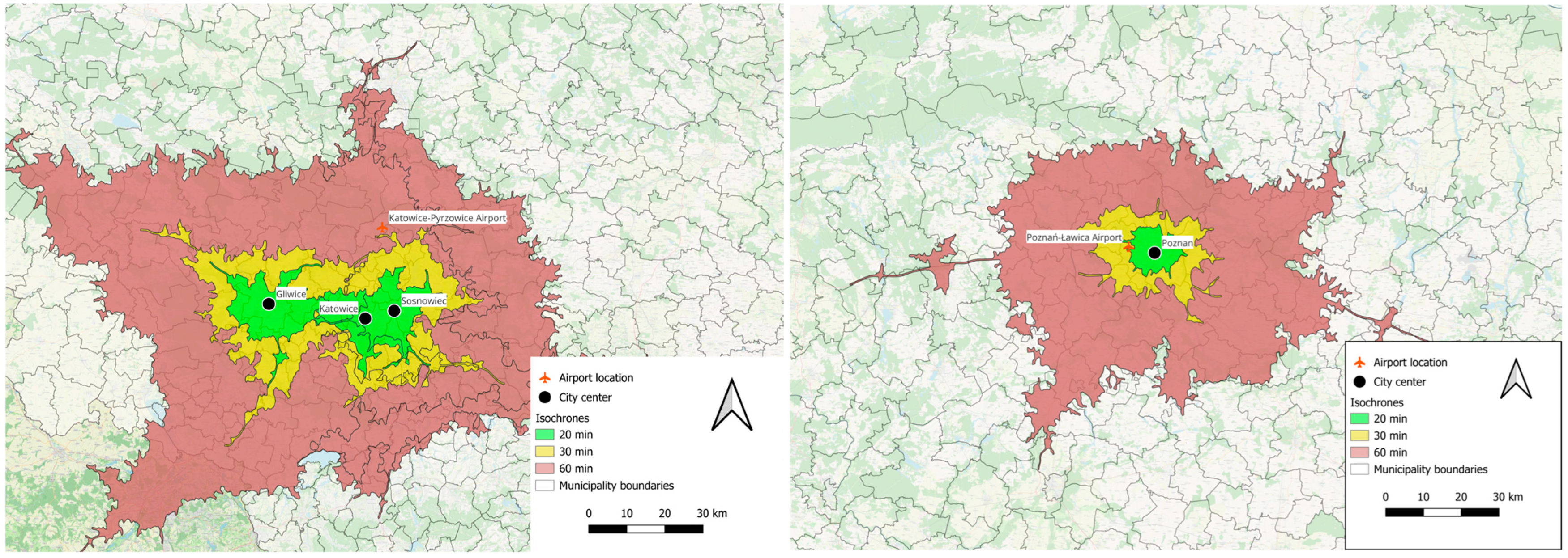 Figure 3). For Katowice Airport, the map illustrates the location of the airport relative to the three main agglomeration centers: Katowice, Gliwice, and Sosnowiec. The visualization includes 20, 30, and 60 min isochrones originating from each of these cities, demonstrating their respective travel times to the airport infrastructure. Similarly, for Poznań-Ławica, the map depicts the travel time accessibility from the Poznań city center.