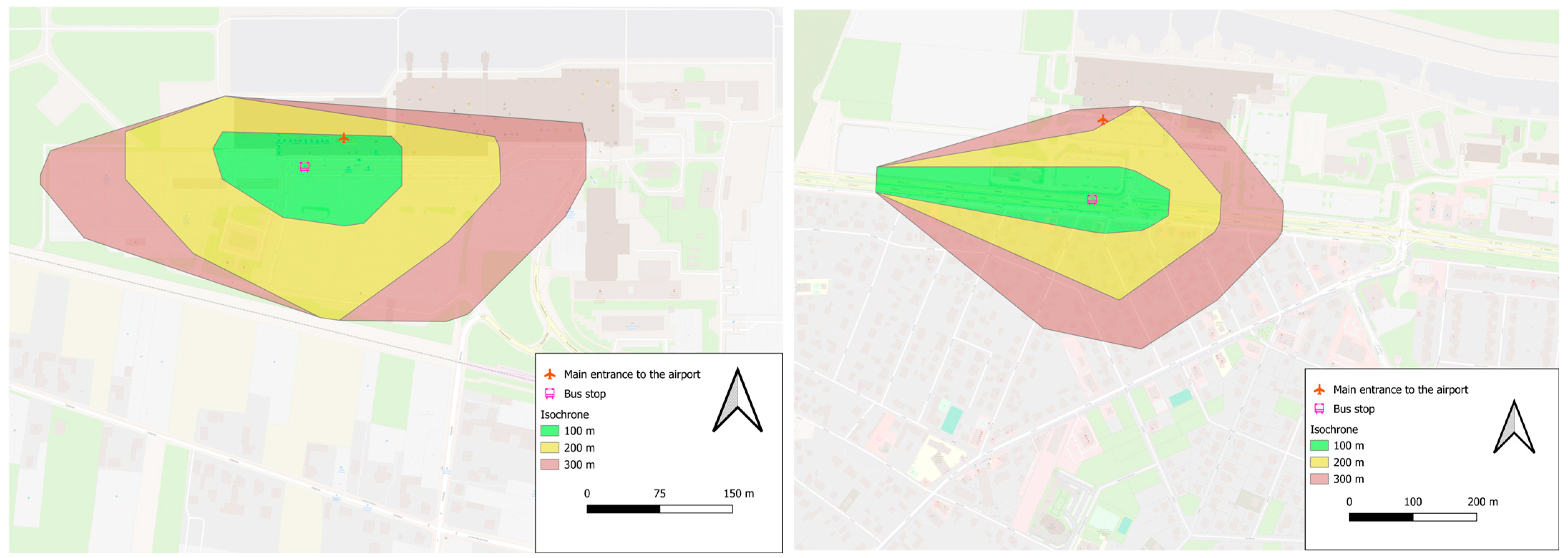 To analyze airports’ role in sustainable urban mobility and their impact on the development of selected areas, a multi-criteria approach was employed, encompassing both transport accessibility analysis and an assessment of how well airports are integrated with public transport systems. Spatial analysis was conducted using QGIS tool (open source software, version 3.4).