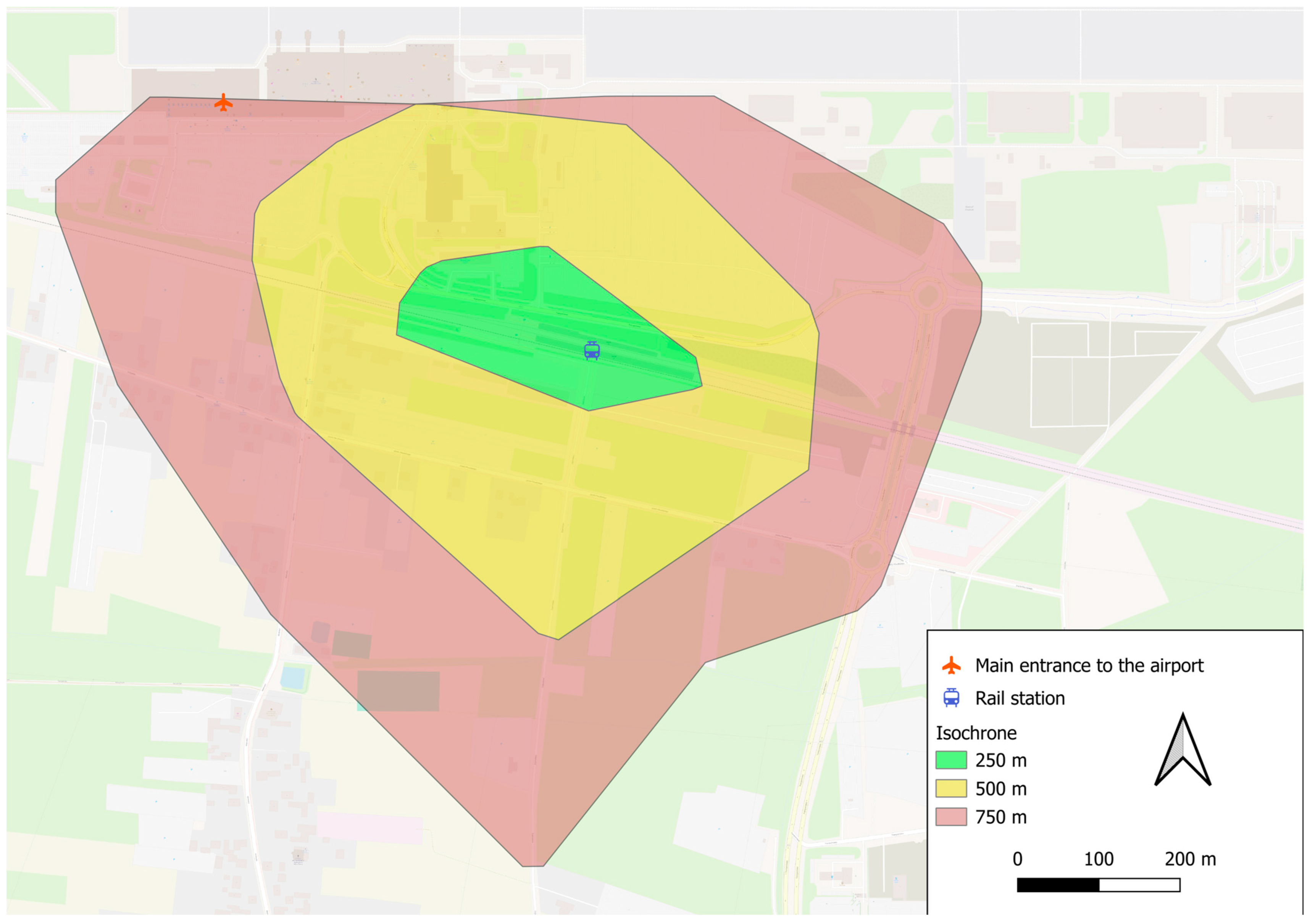 Figure 4. The spatial analysis confirms the compact layout of the transfer node at Katowice Airport compared to the slightly more dispersed arrangement in Poznań.