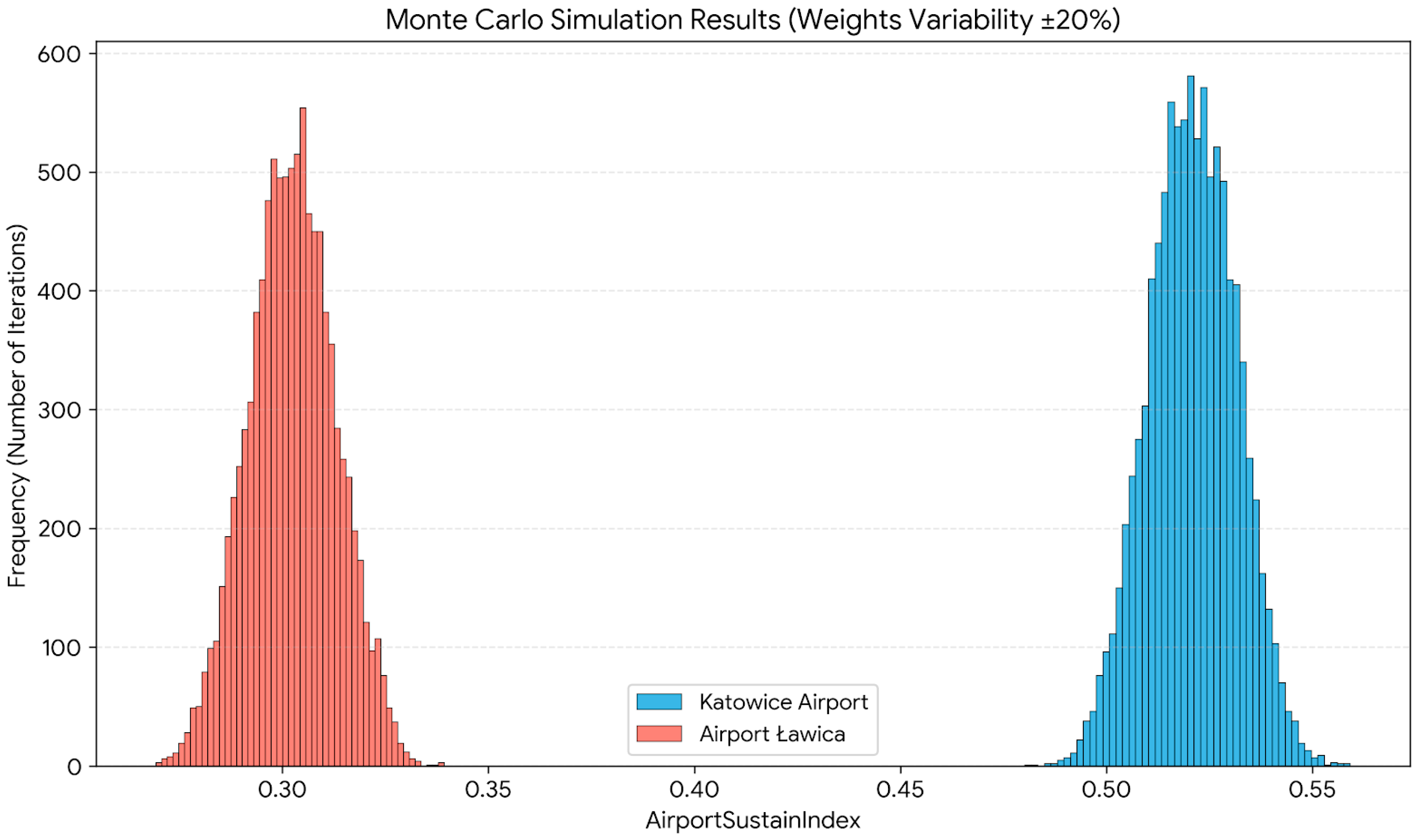 The analysis demonstrated absolute stability of the results. In 100% of the simulation runs, Katowice Airport (KTW) maintained a higher sustainability index than Poznań-Ławica (POZ). The statistical summary of the simulation is as follows: