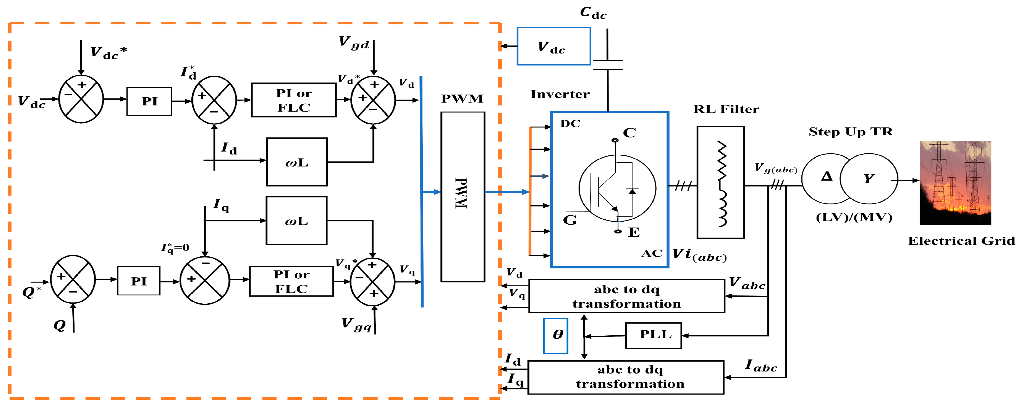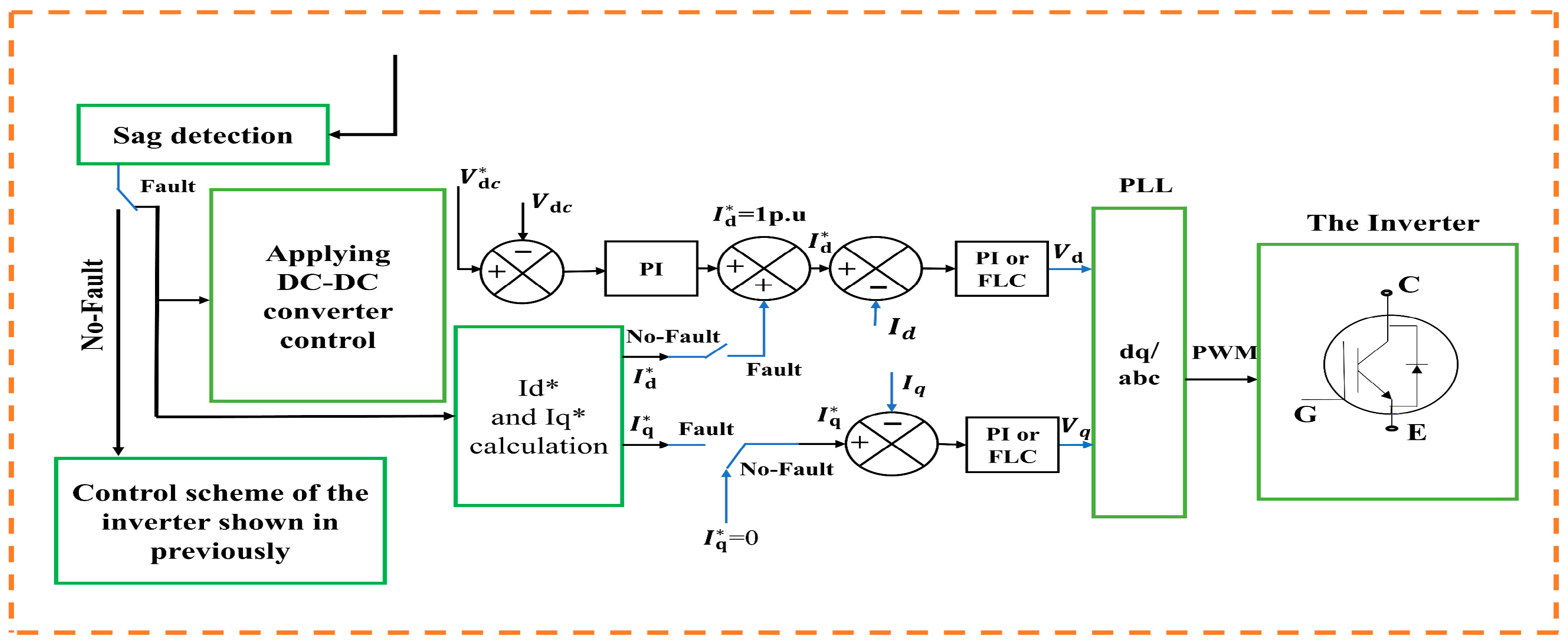 - Unified integrated control architecture for LVRT: A coordinated control framework is developed that jointly manages DC-link voltage regulation, reactive current support, and mode switching during voltage sags, enabling consistent operation and ride-through compliance under representative fault scenarios.