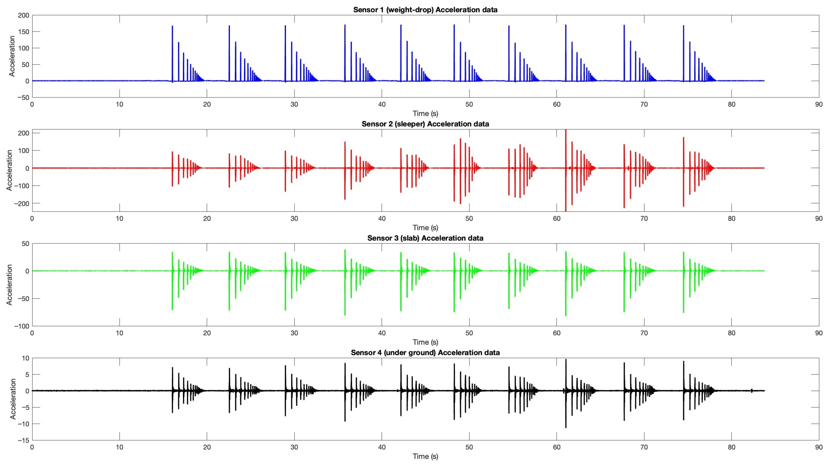 Measured acceleration response (m/s2) for the 100 cm drop-weight impact on Track 2, shown for a representative trial from 10 repeated drops at the same impact location. The maximum acceleration magnitudes recorded were 171.10 m/s2 (drop weight), 245.86 m/s2 (sleeper), 82.39 m/s2 (slab), and 11.34 m/s2 (underground).