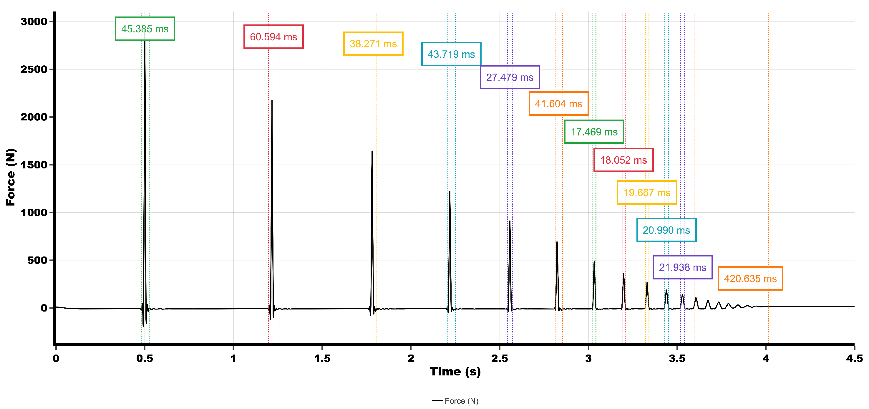 Representative single-drop force-time profile (100 cm, Track 2) in multi-drop series: contact phase, max load, and rebound.