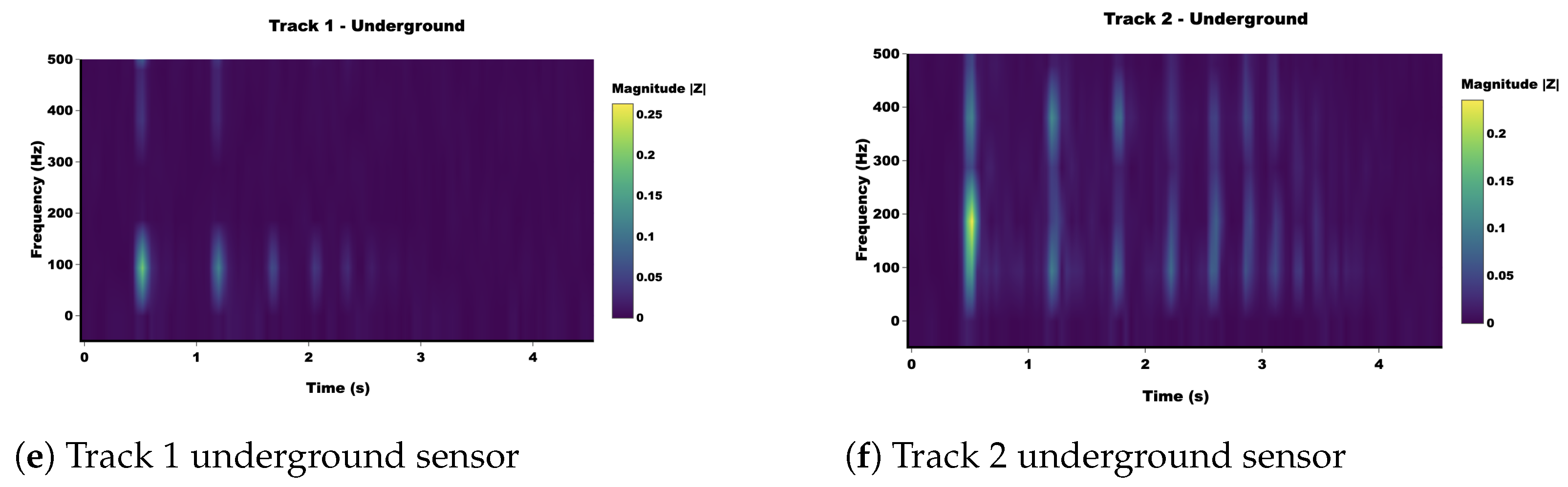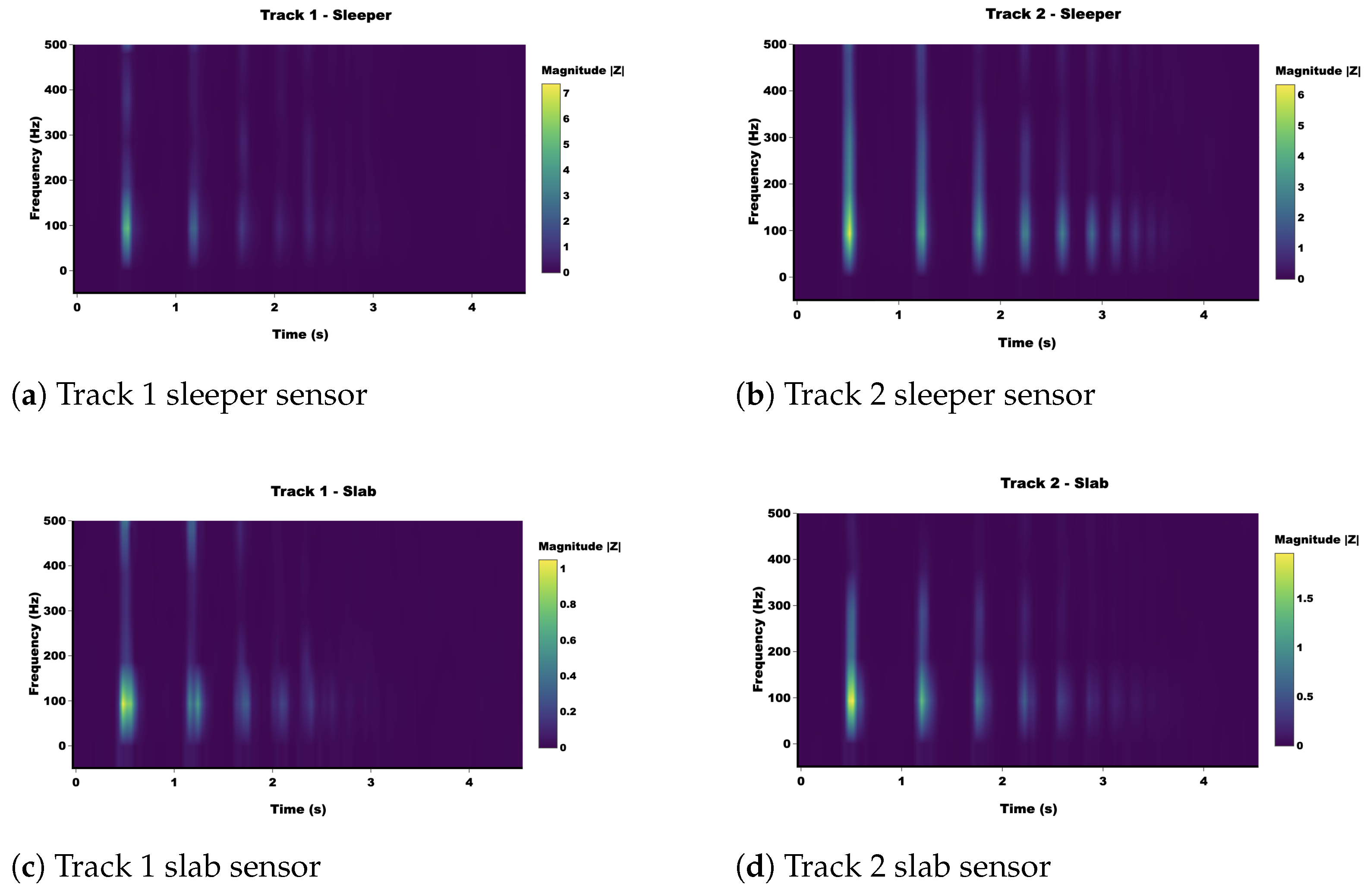 Hann-windowed STFT spectrograms of the acceleration response for Track 1 and Track 2 at the sleeper, slab, and underground sensors, showing the different time–frequency distributions and persistence of vibration energy.