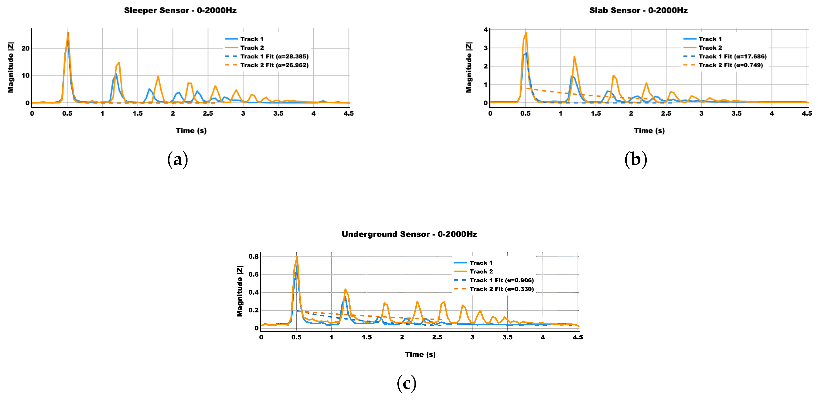 Band-integrated magnitude of the acceleration response in the 0–2000 Hz band for the sleeper, slab, and underground sensors under Track 1 and Track 2. Exponential envelope fits to the decay curves are used to estimate configuration-dependent decay rates of ground-borne vibration. (a) Sleeper sensor, 0–2000 Hz band-integrated magnitude for both track configurations. (b) Slab sensor, 0–2000 Hz band-integrated magnitude for both track configurations. (c) Underground sensor, 0–2000 Hz band-integrated magnitude for both track configurations.