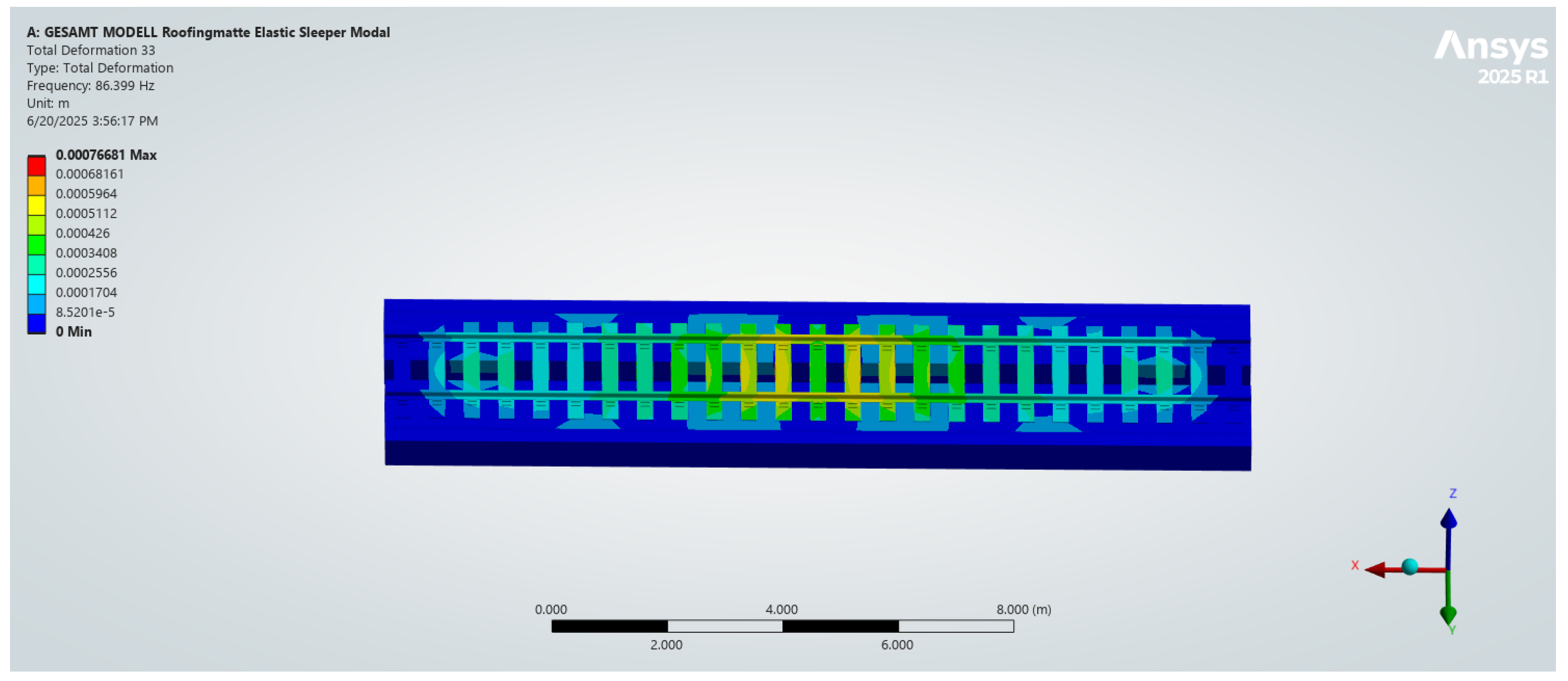 Mode shape of the railway track at natural frequency 86.40 Hz.