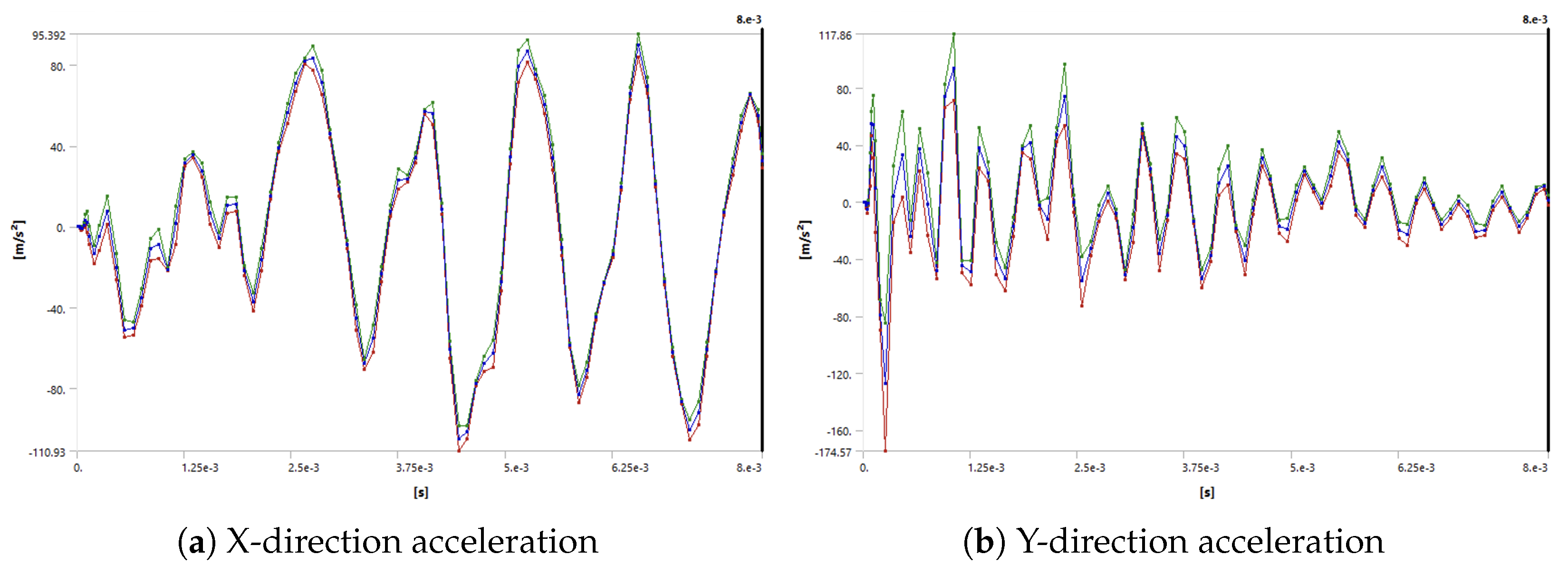 2, respectively, compared to Track 1, where the corresponding peak accelerations were 55.66 m/s
