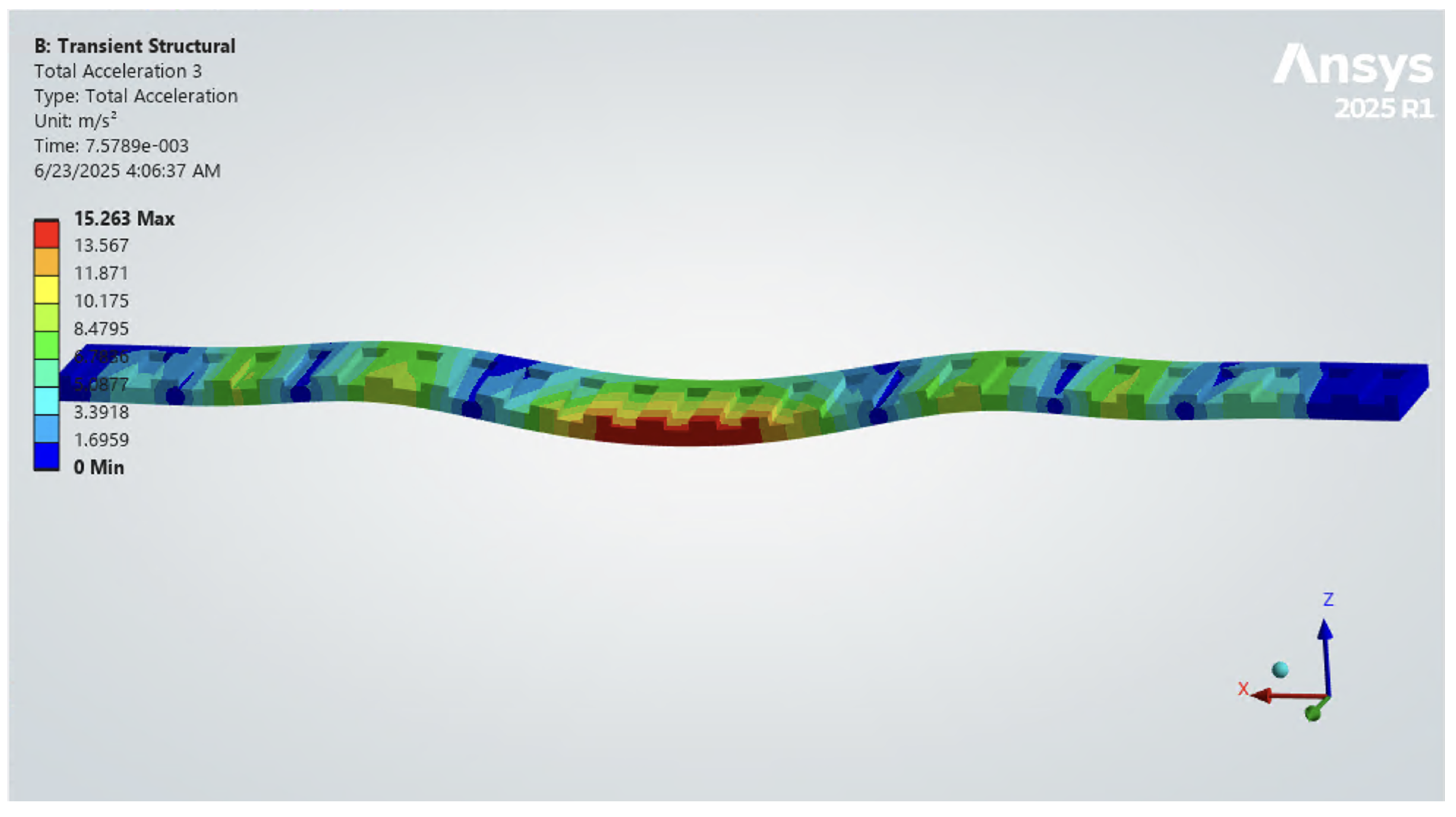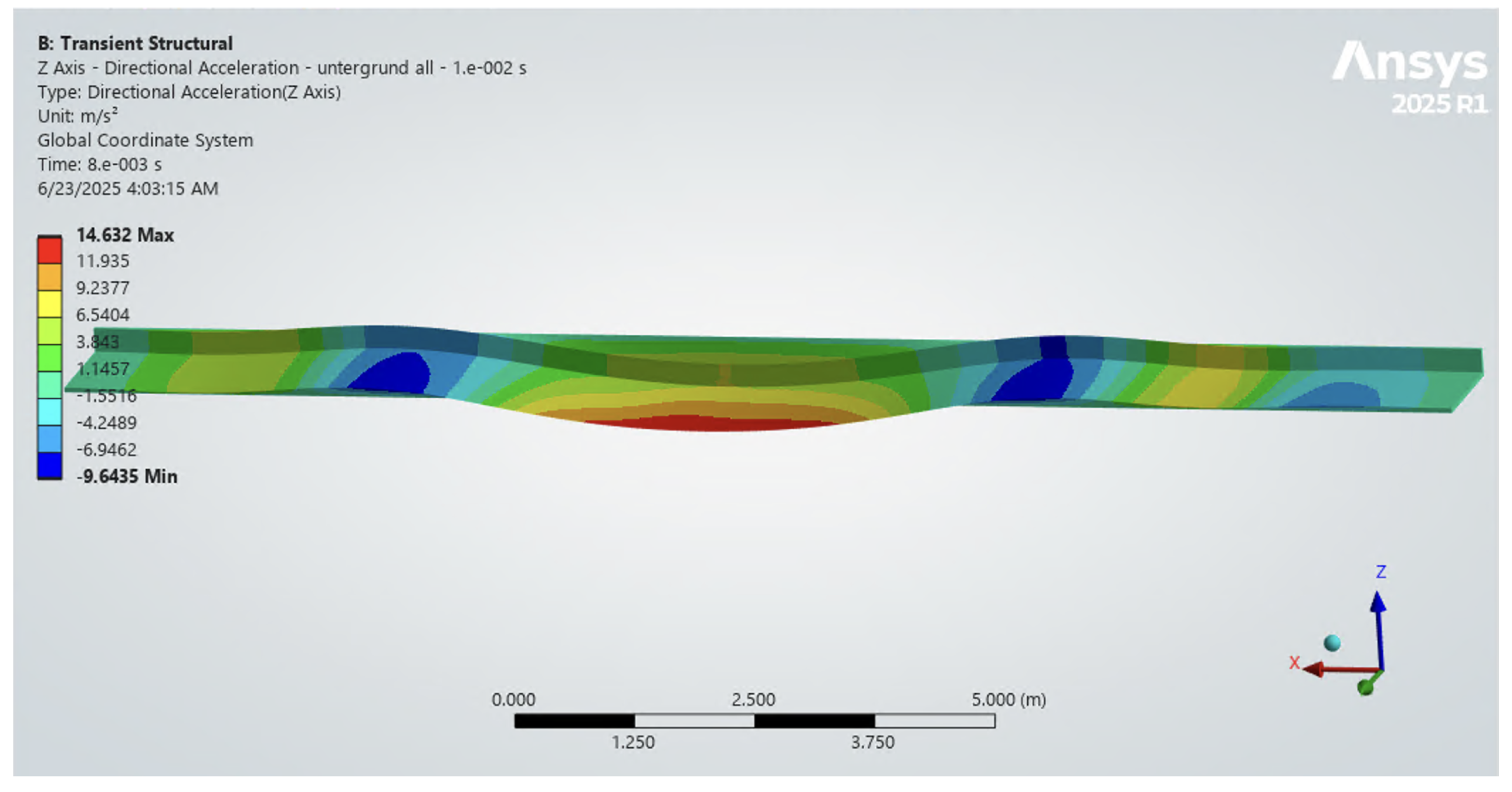 Computed directional acceleration response (m/s2) of the underground structure for the 100 cm drop-weight excitation in the calibrated finite element model, enabling direct comparison with the measured underground sensor response.